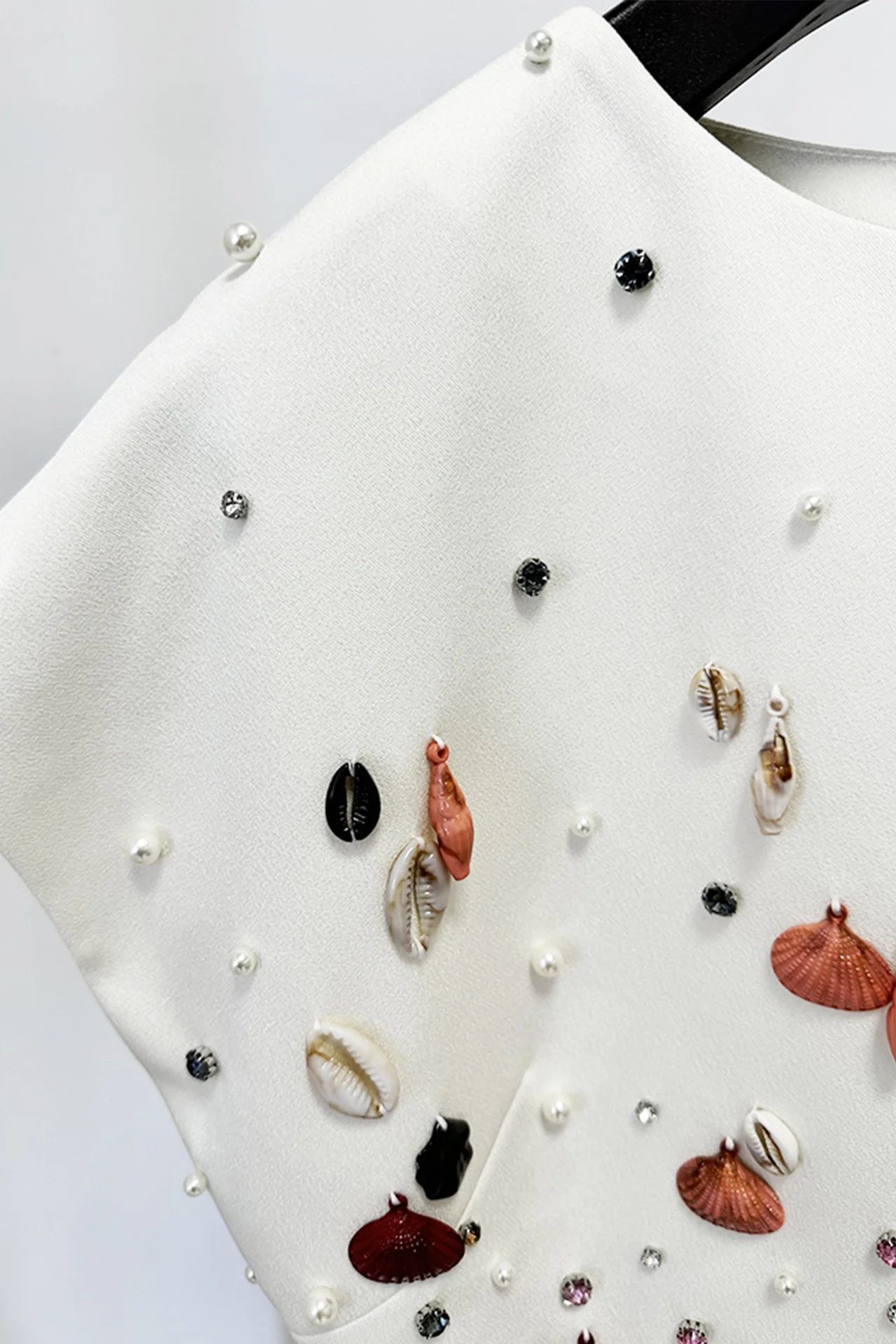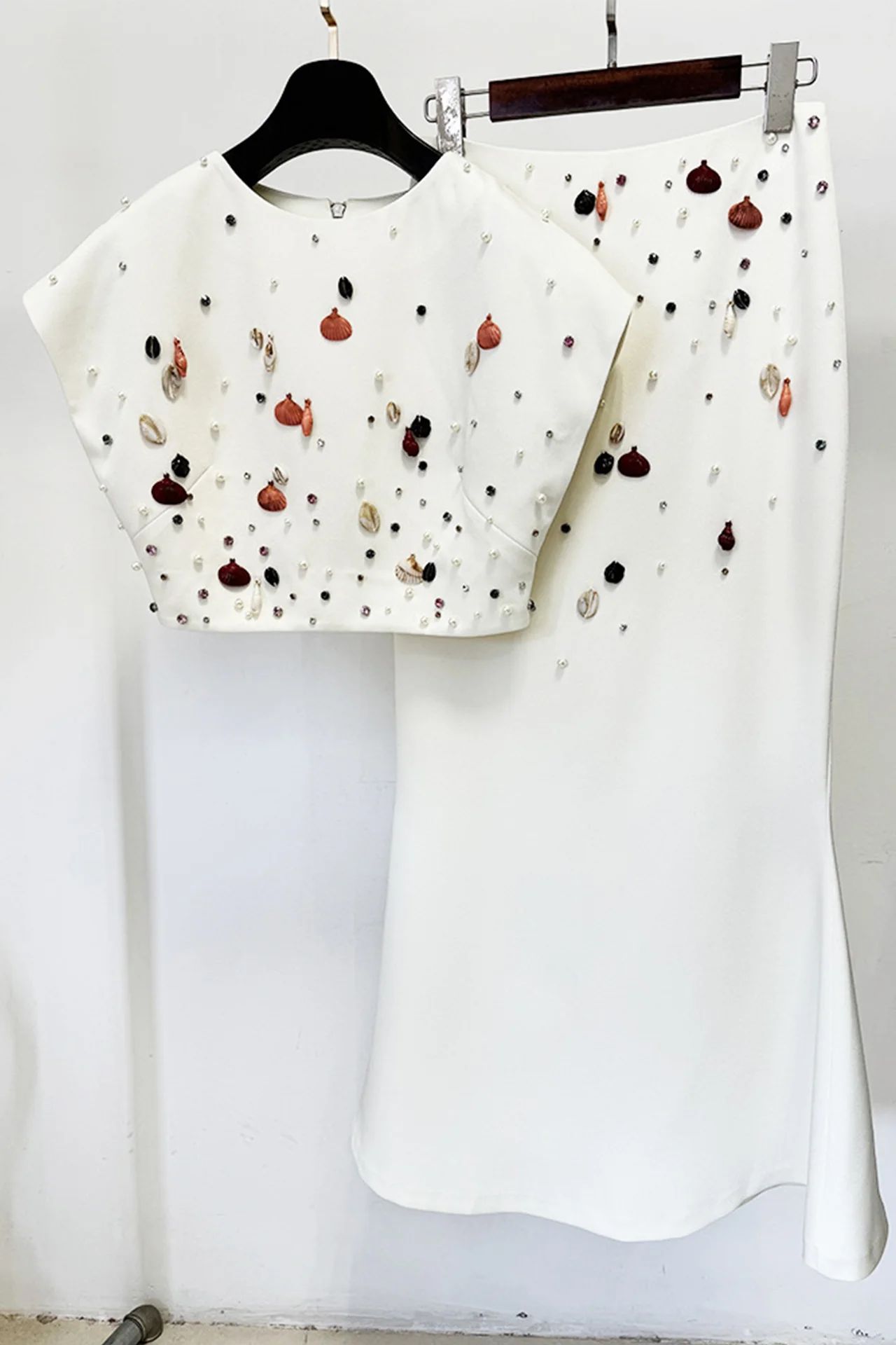 Designul său include un top structurat care accentuează talia, conferind un efect de siluetă sculptată, decorat cu detalii rafinate din strasuri colorate pentru un plus de strălucire și glamour. Partea inferioară este completată cu o fustă ce urmează ușor linia corpului, realizată cu precizie pentru a adăuga un element extravagant și modern ținutei. Materialul compleului este elastic și de înaltă calitate, asigurând un confort sporit și o potrivire perfectă.