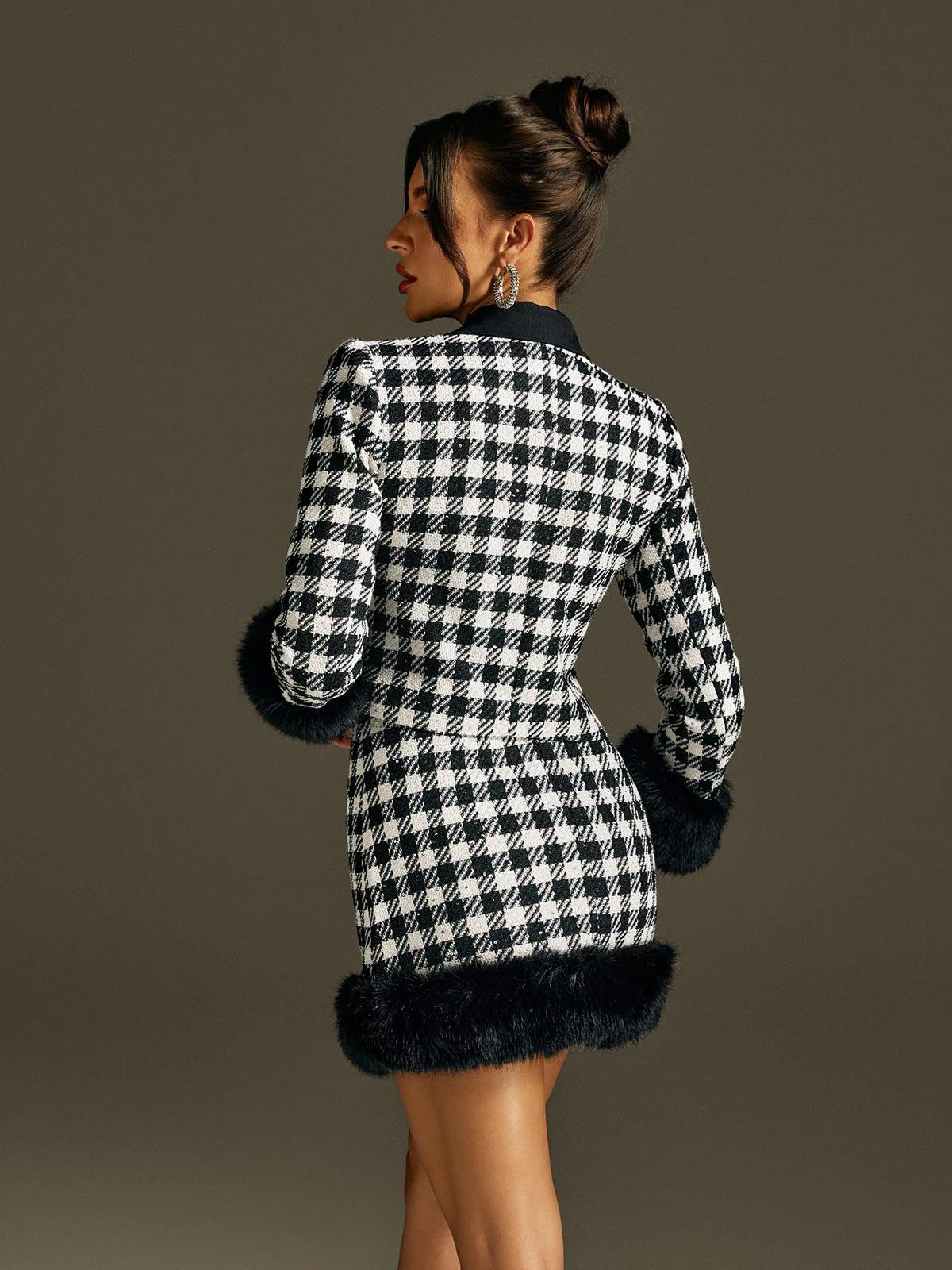 Costum cu fustă mini elegantă, realizată din tweed cu model clasic pepit alb-negru, ce îmbină rafinamentul atemporal cu accente moderne. Croiala cambrată evidențiază silueta, iar închiderea frontală cu nasturi decorativi adaugă un aer sofisticat. Gulerul structurat și buzunarele aplicate oferă un plus de stil, în timp ce manșetele și tivul sunt decorate cu blană pentru un efect luxos și feminin. Ideală pentru evenimente elegante, cocktailuri sau apariții statement, această rochie este alegerea perfectă pentru un look chic și rafinat.