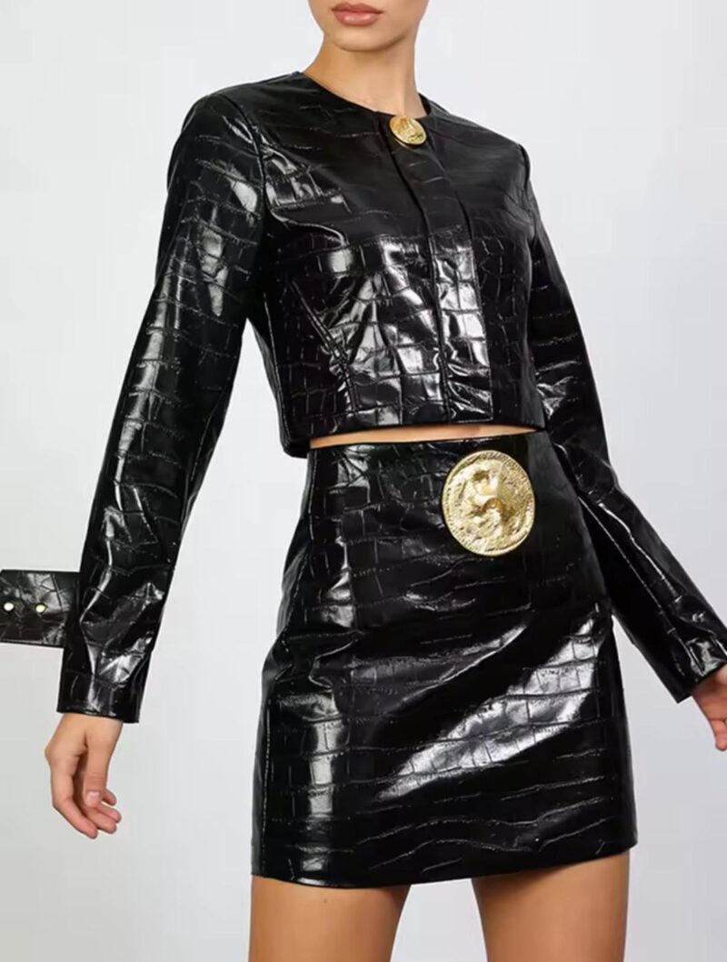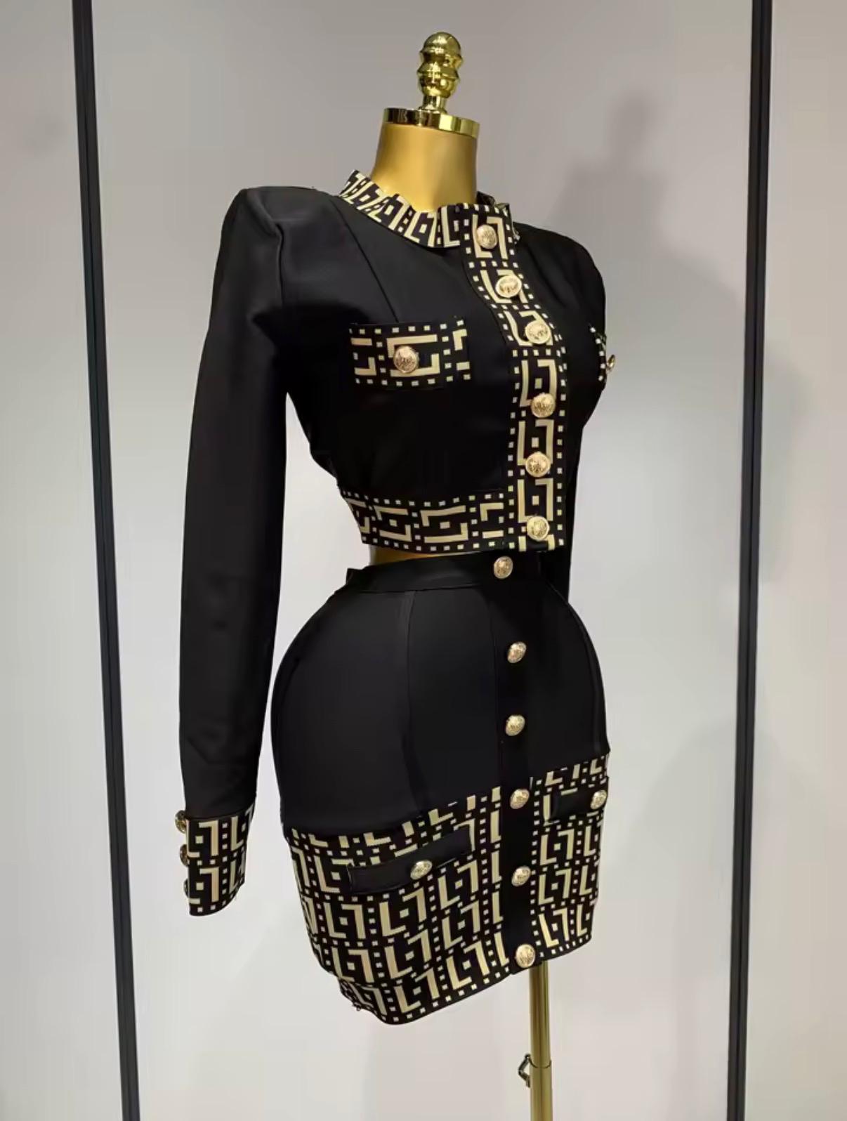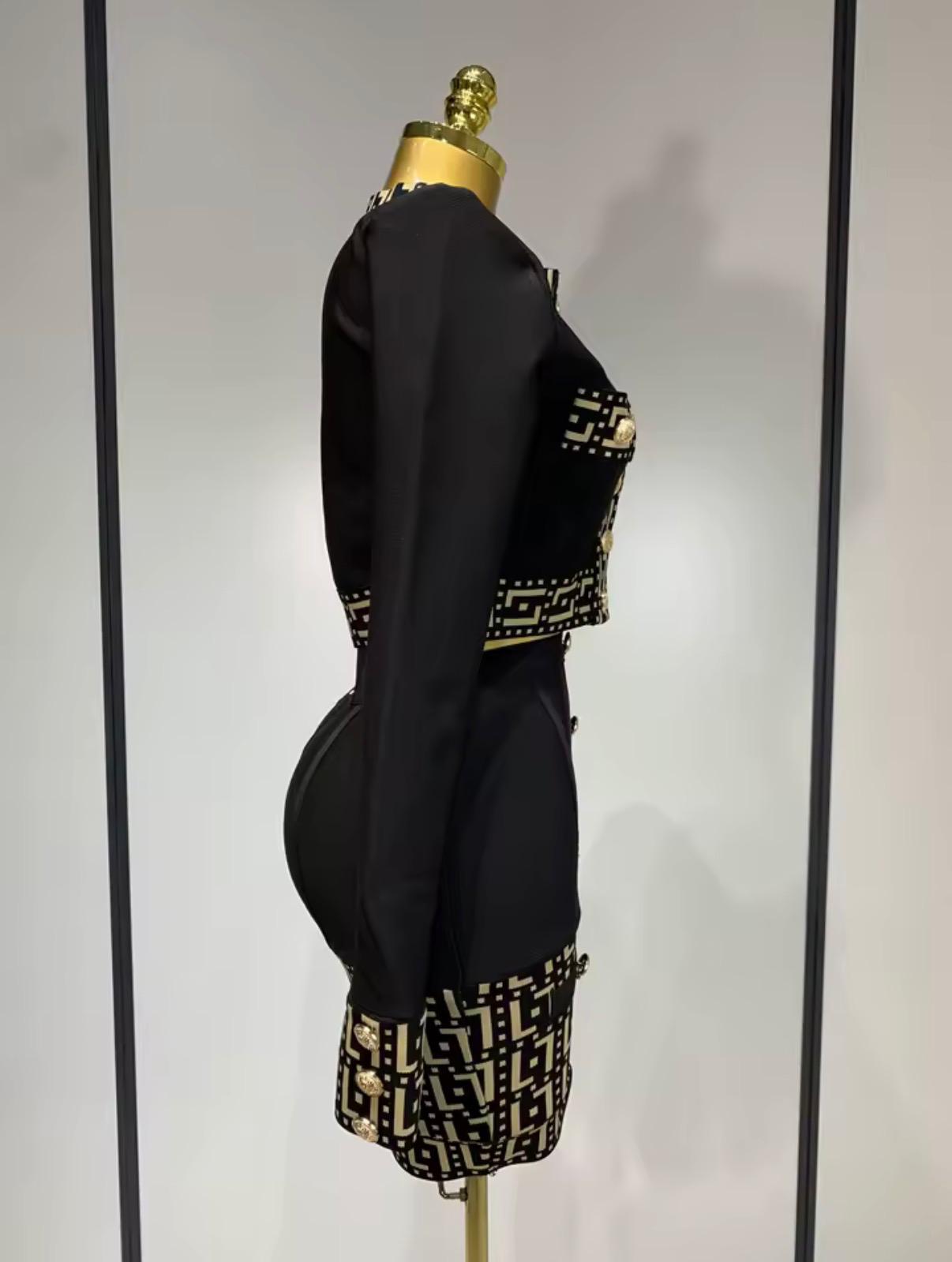 Ținuta are un aer luxos și îndrăzneț, realizată într-o combinație clasică de negru, alb și accente aurii. Designul este compus dintr-un sacou scurt, cambrat, cu nasturi decorativi metalici și inserții cu model geometric, care creează un contrast puternic și rafinat. Linia umerilor este bine definită, oferind o siluetă structurată și modernă.