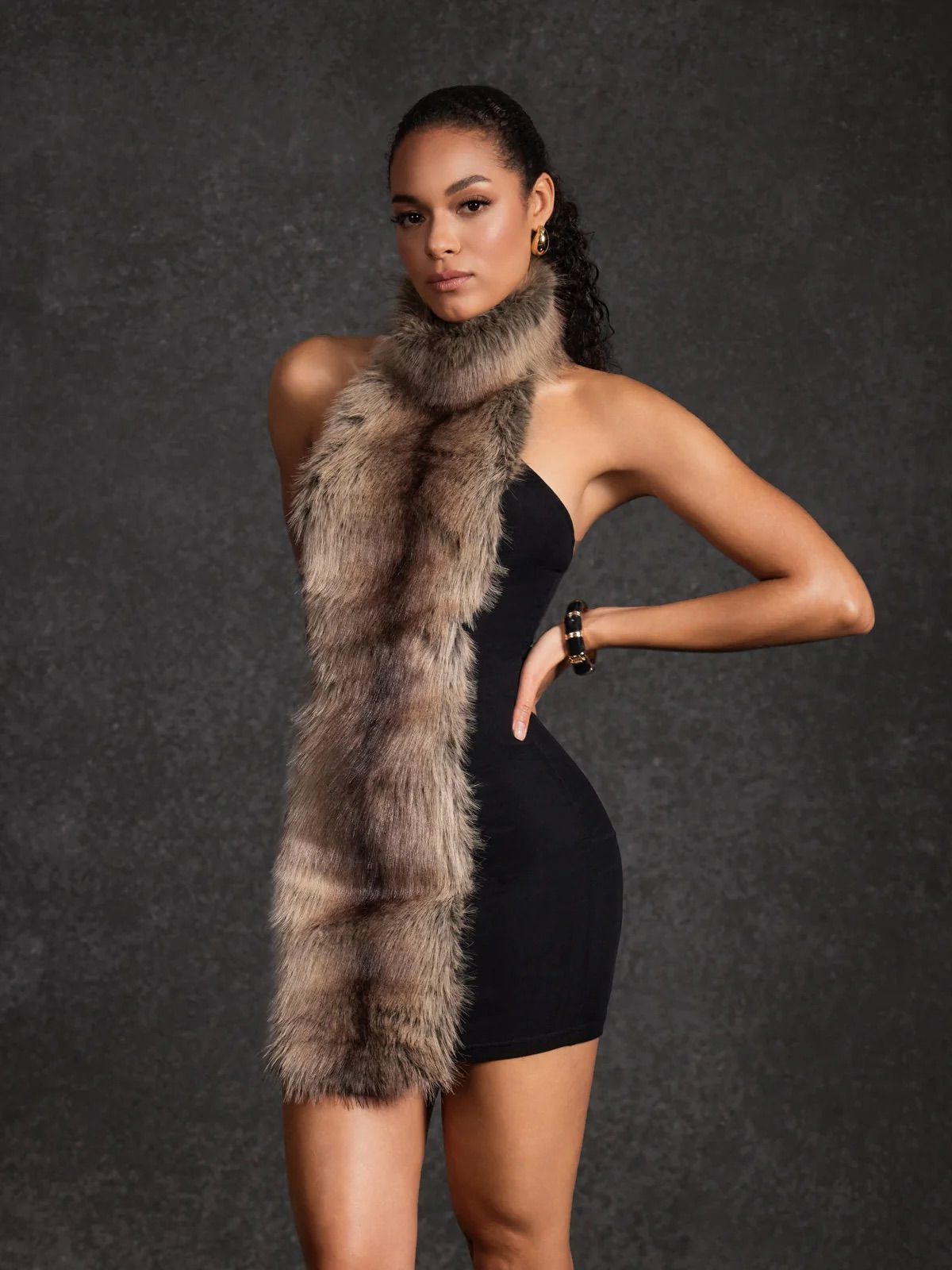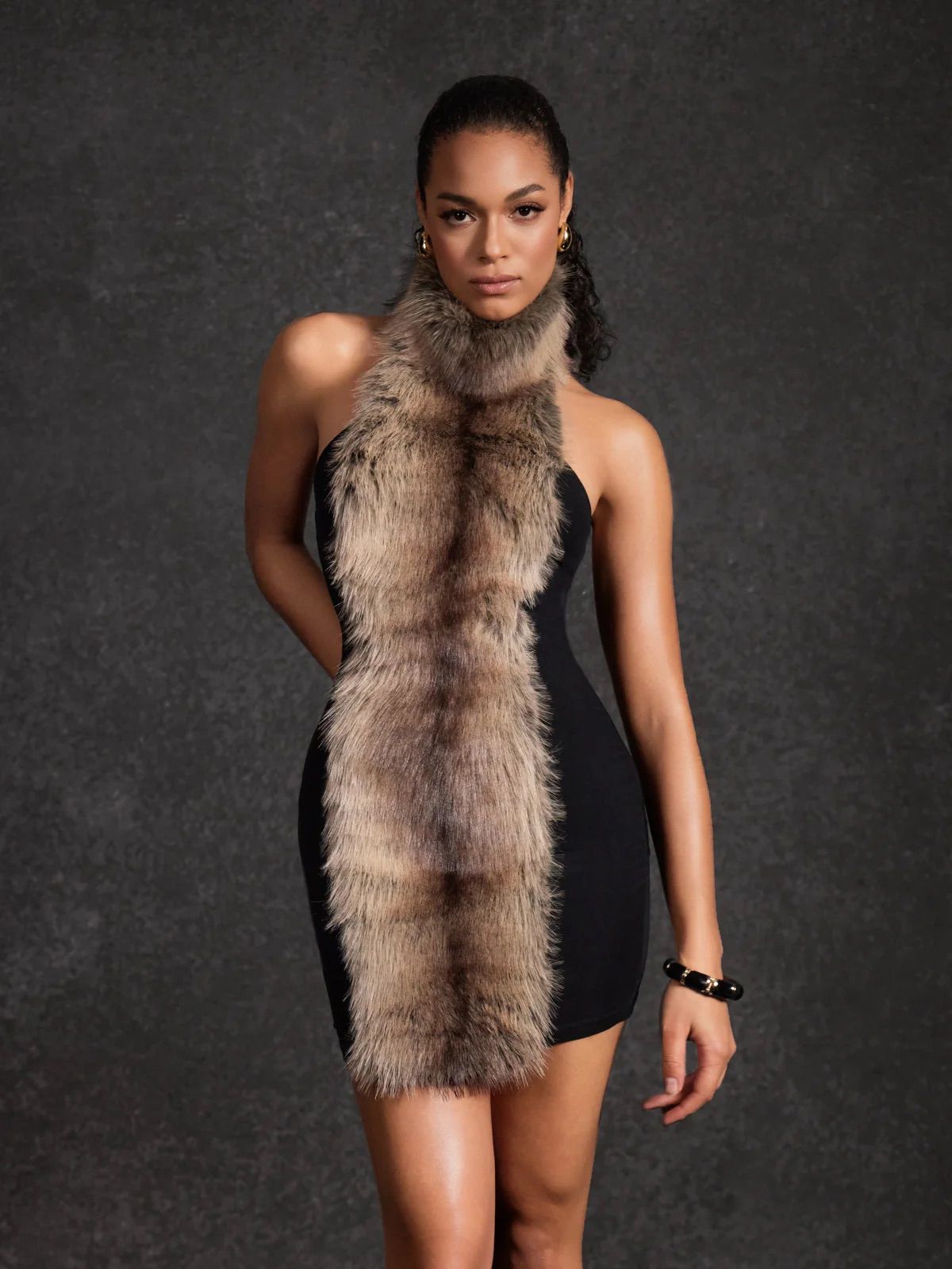 Este o rochie mini, neagră, cu o croială mulată care urmărește linia corpului și pune accent pe siluetă. Designul este minimalist, fără bretele vizibile, ceea ce îi oferă un aer elegant și senzual. Elementul statement este aplicația din blană artificială care cade vertical pe centru, de la gât până aproape de tiv, adăugând textură, contrast și un vibe luxos.