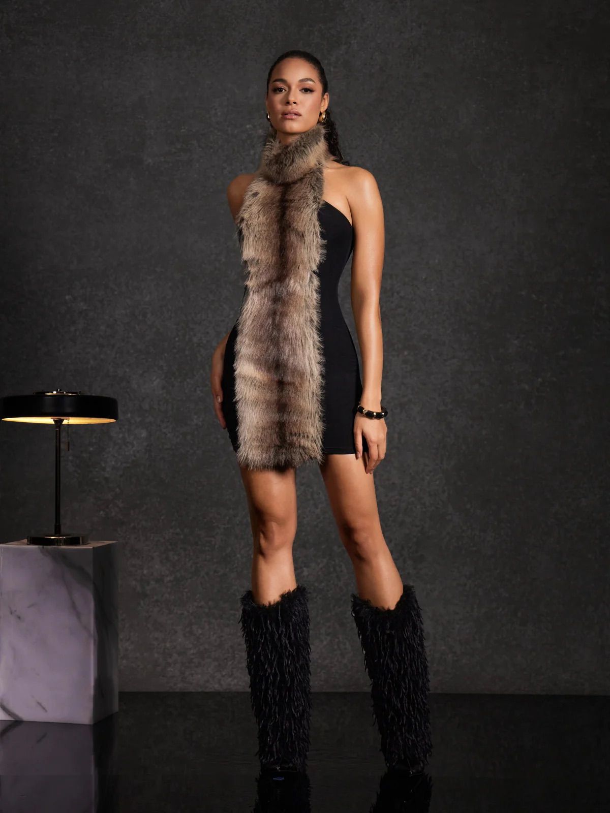 Rochia este stilizată cu cizme înalte cu blană, ceea ce completează look-ul dramatic și sofisticat, perfect pentru o apariție de seară sau un eveniment fashion-forward.