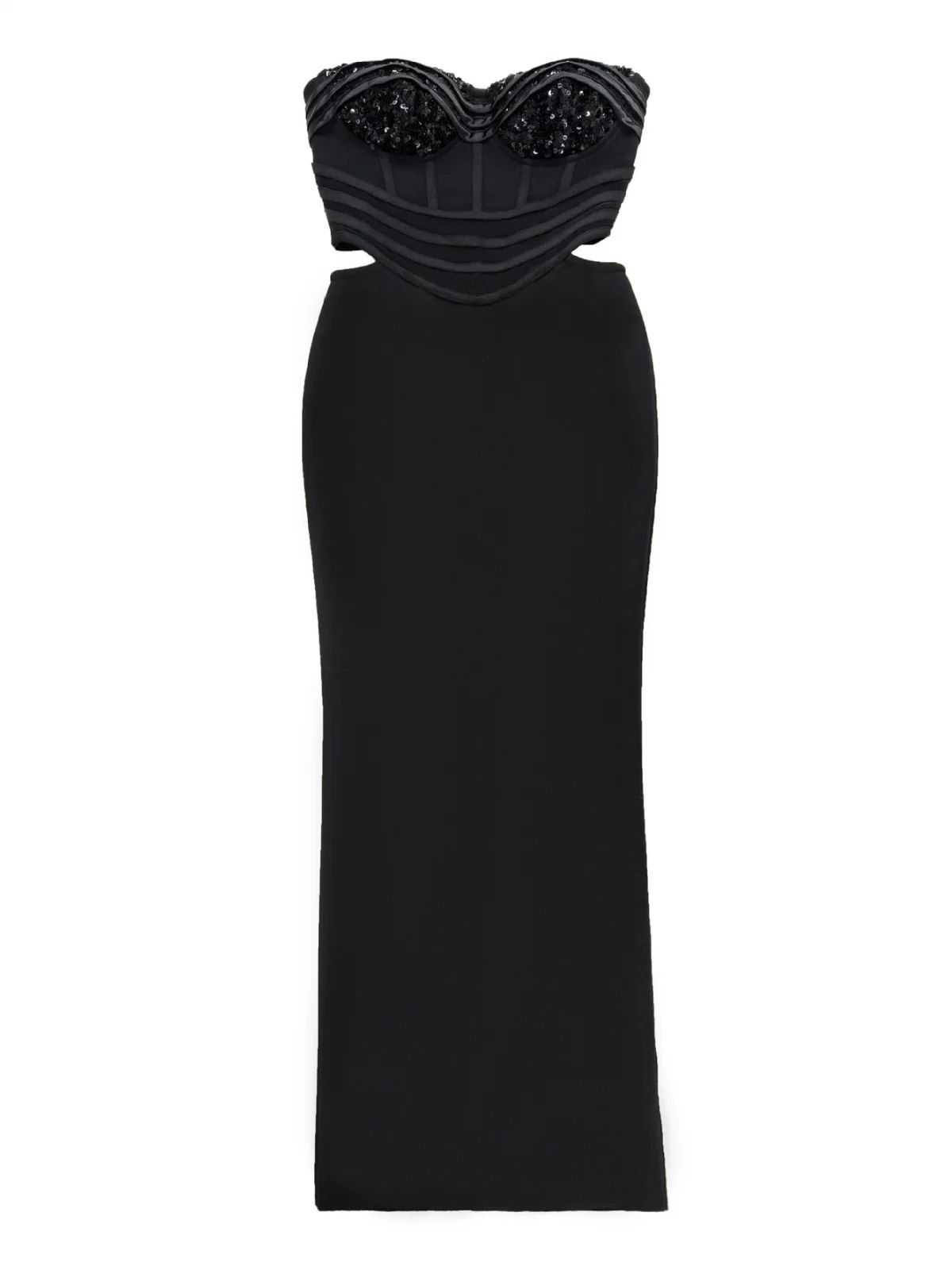 Această rochie de ocazii neagră, cu un design luxuriant și sofisticat, este o alegere deosebită pentru evenimentele speciale unde eleganța și farmecul sunt esențiale.