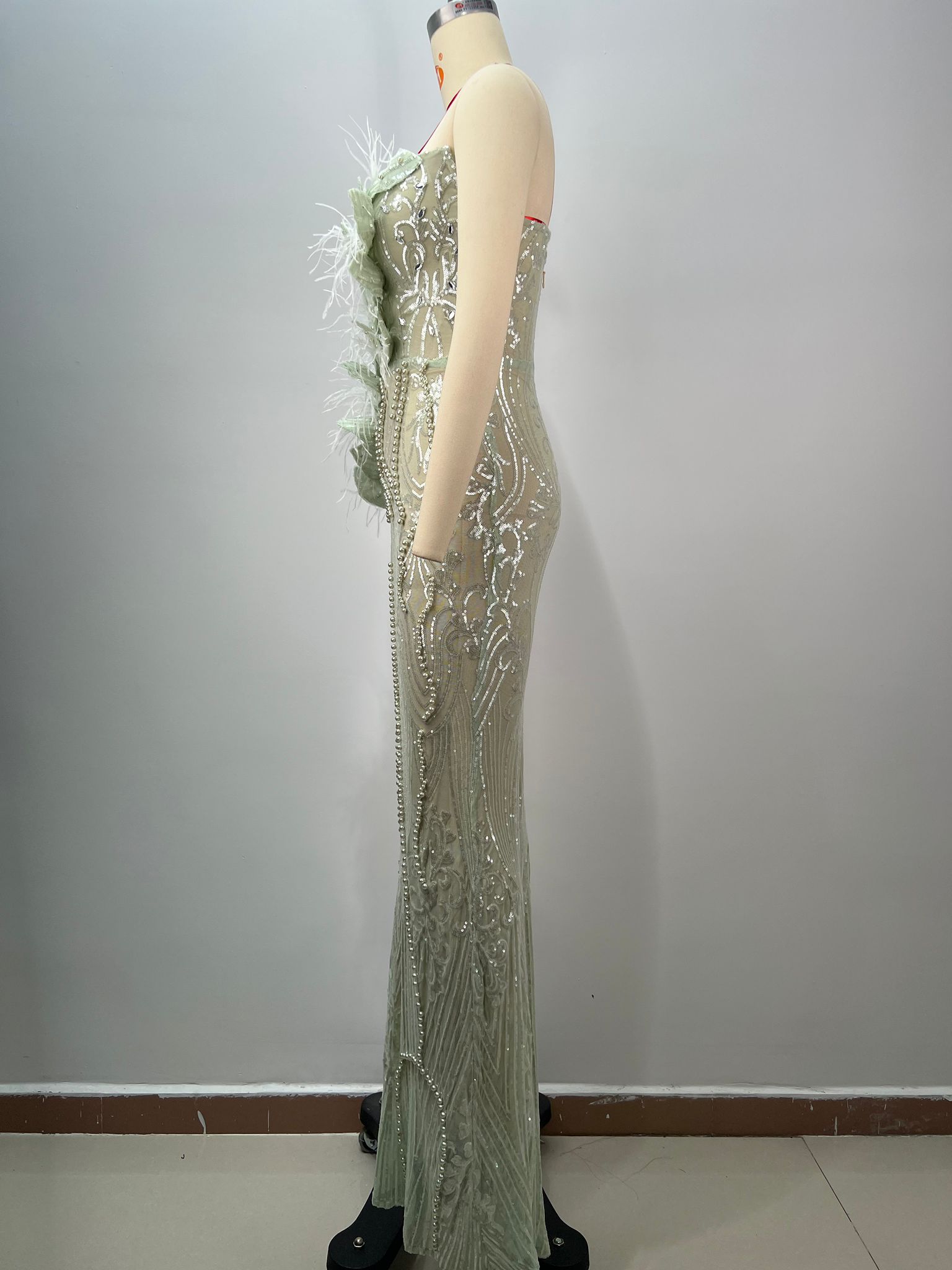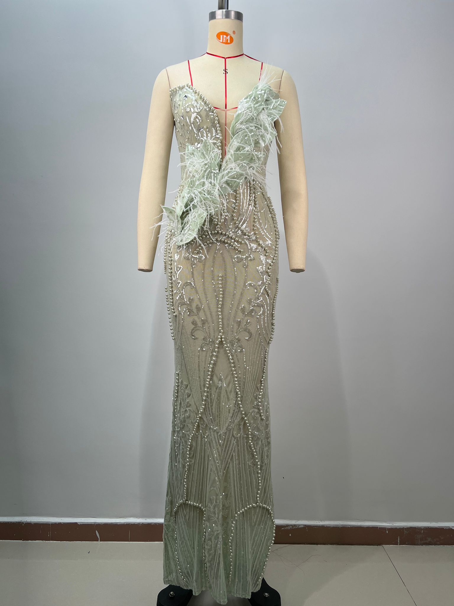 - Detaliu deosebit: Întreaga rochie este decorată cu pietre fine, iar decolteul și bustul sunt puse în evidență de penele, decorații ce adaugă un plus de feminitate și rafinament, accentuând frumusețea naturală a oricărei femei.
