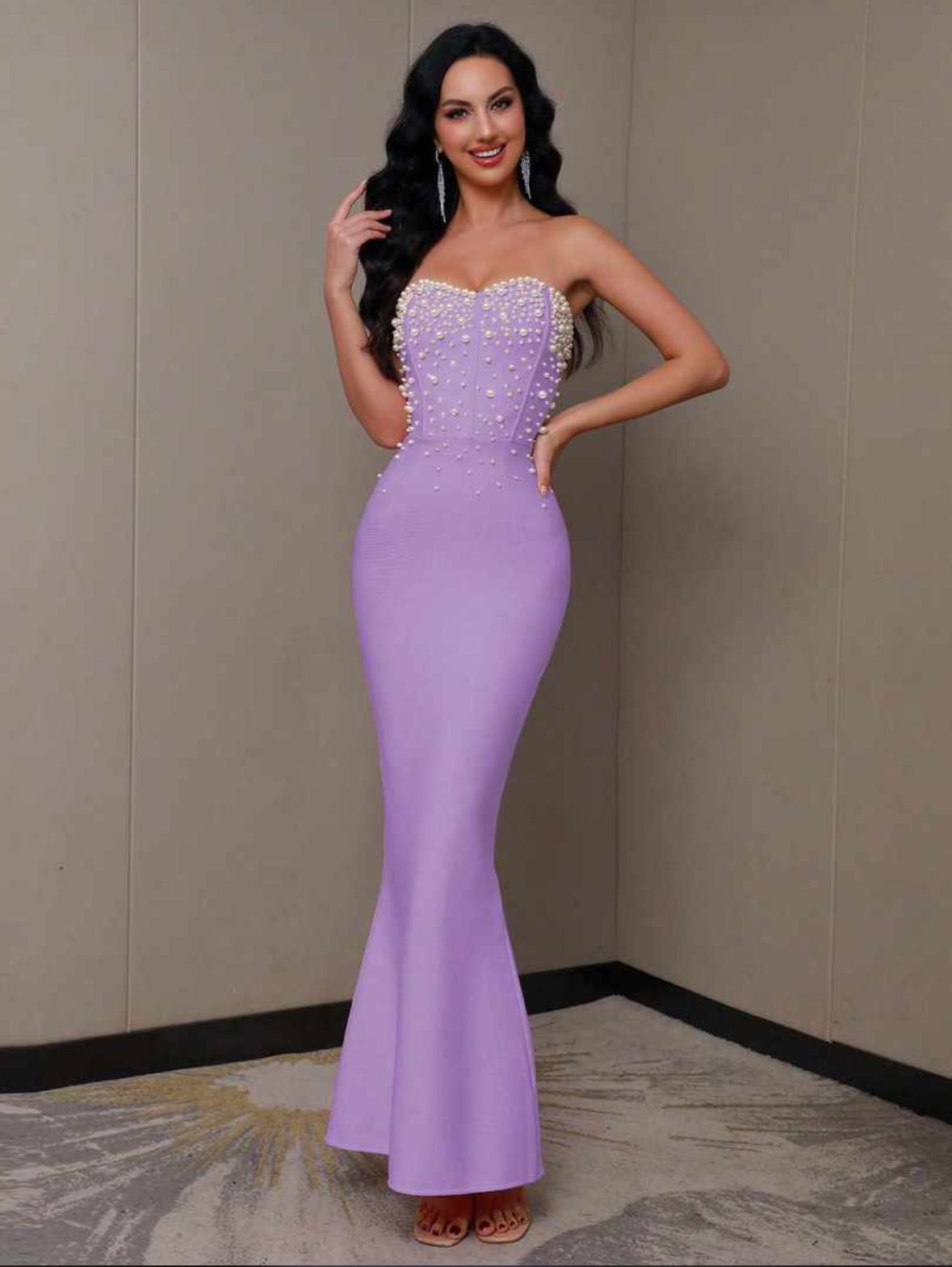 Croiala sirenă subliniază talia și șoldurile, continuând într-un fald dramatic care se extinde spre podea, creând un efect de alungire și un aspect regal. Mânecile lungi adaugă o notă de mister și rafinament, echilibrând liniile senzuale ale rochiei.
