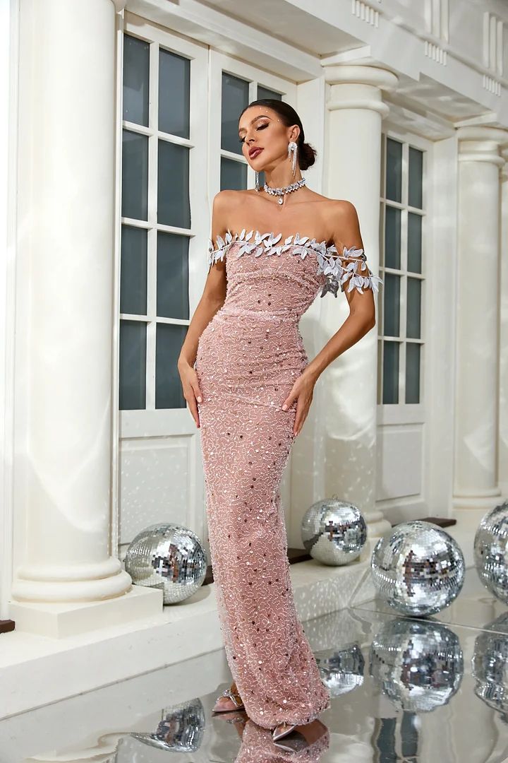 - Detaliu deosebit: Corsetul cu umeri căzuți și decorațiunile strălucitoare cu motive naturale adaugă un plus de feminitate și rafinament, accentuând frumusețea naturală a oricărei femei.