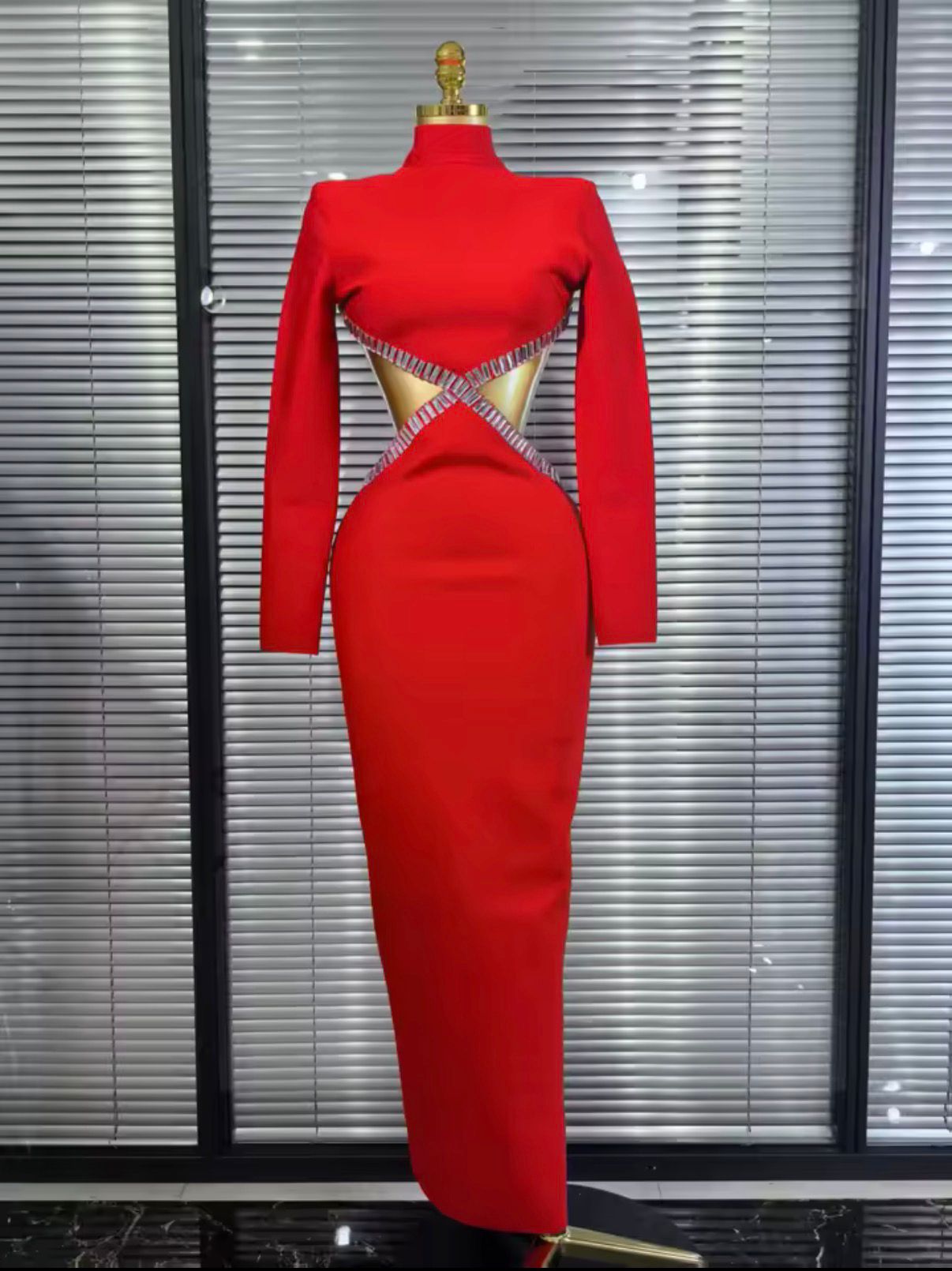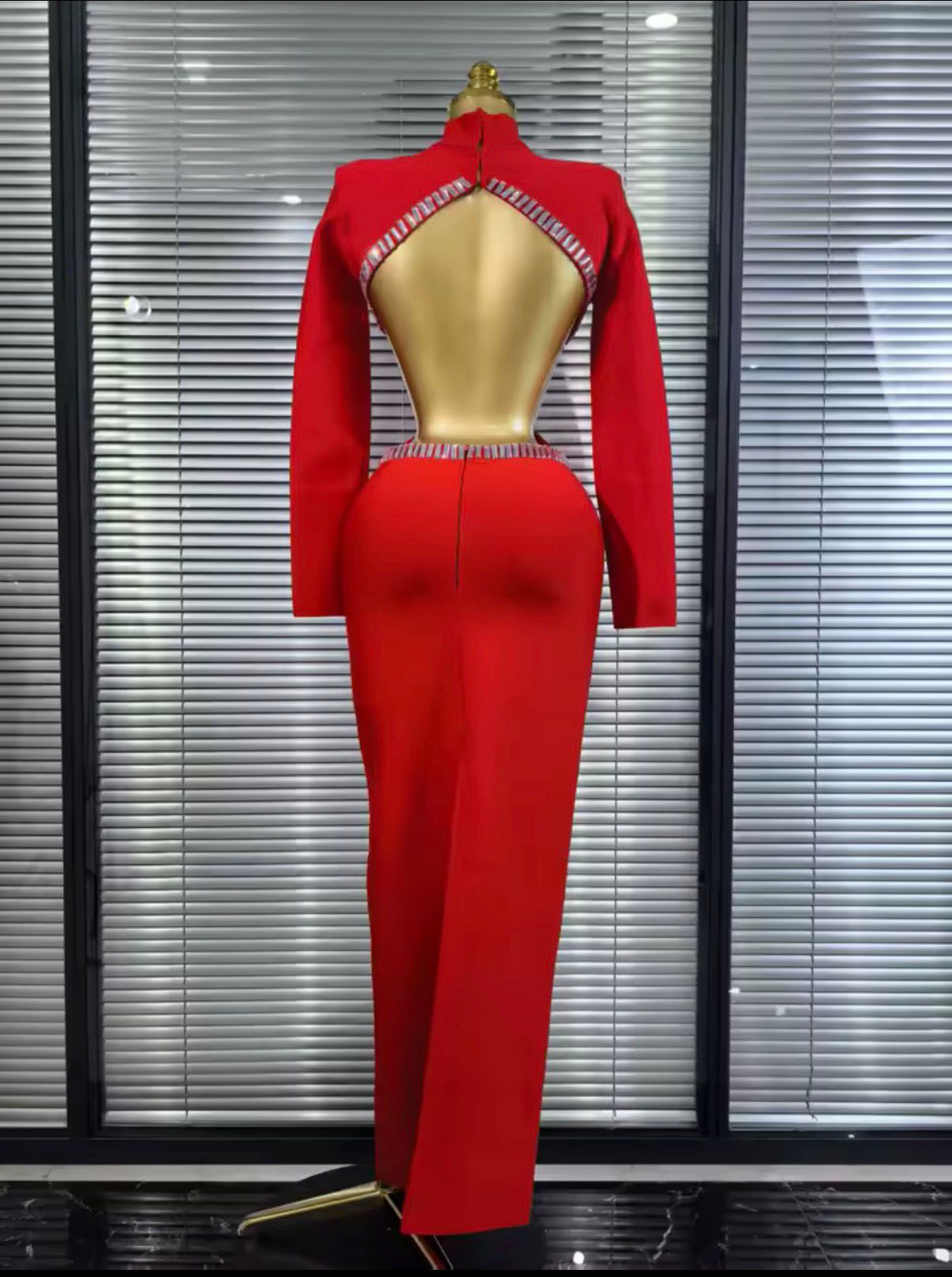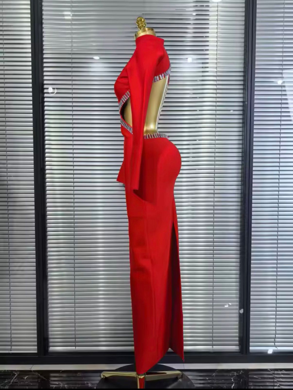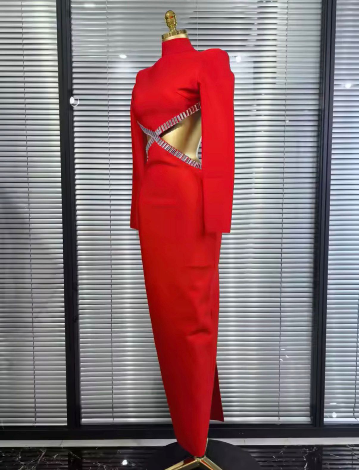 Rochia „Scarlet Desire” este definiția senzualității moderne. Realizată într-o nuanță intensă de roșu aprins, această rochie lungă mulată urmărește perfect linia corpului, evidențiind silueta într-un mod elegant și seducător. Designul cu mânecă lungă și guler înalt creează un contrast sofisticat cu decupajele îndrăznețe din zona taliei.