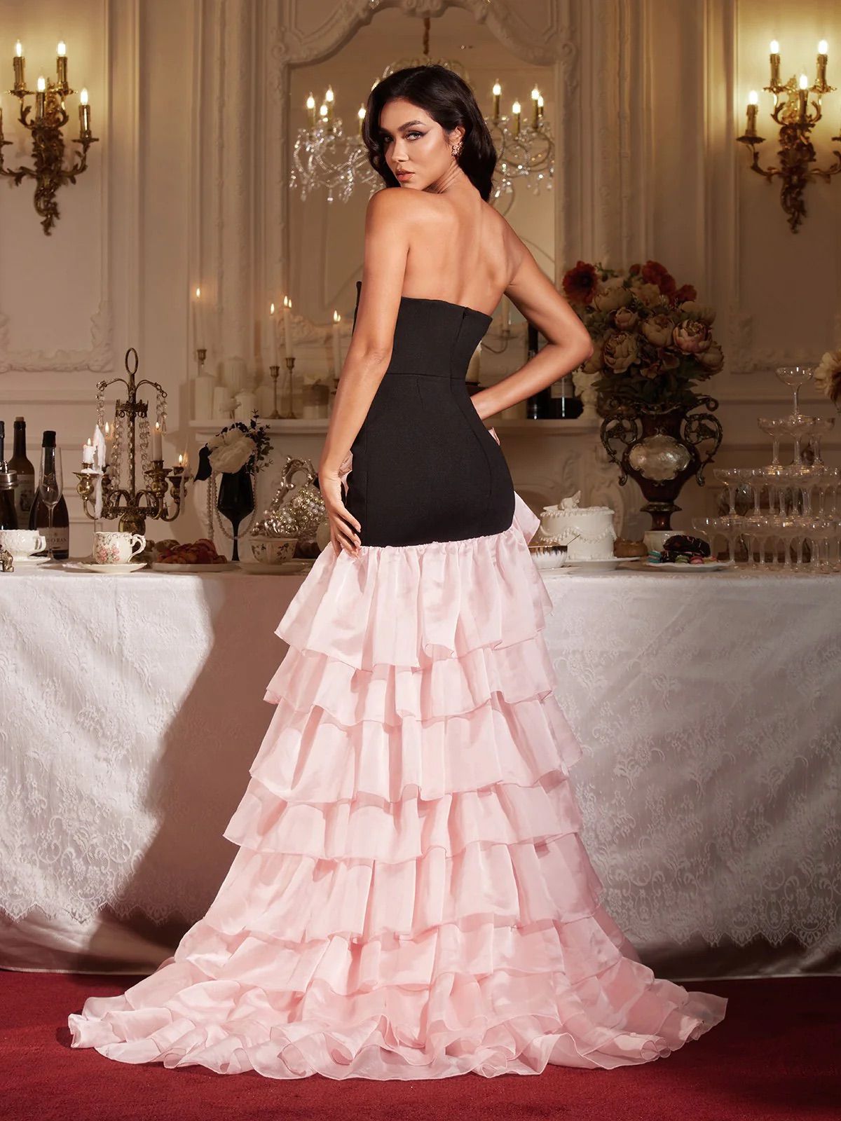 Elementul central este o aplicație florală voluminoasă de culoare roz pal, situată în zona șoldului. De la această floare și de-a lungul piciorului până la tivul rochiei se extind volane (ruffles) stratificate din șifon sau material crep, de asemenea de culoare roz pal.
