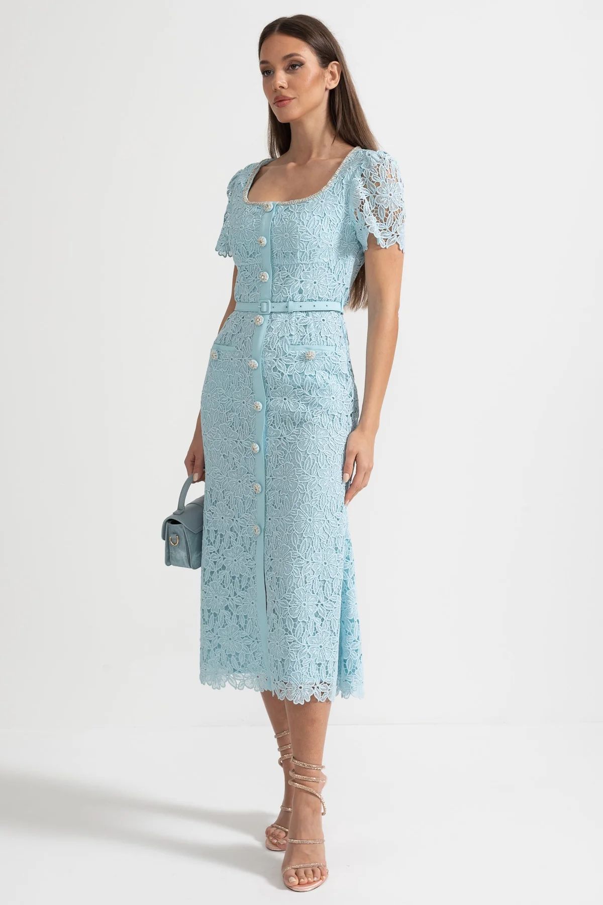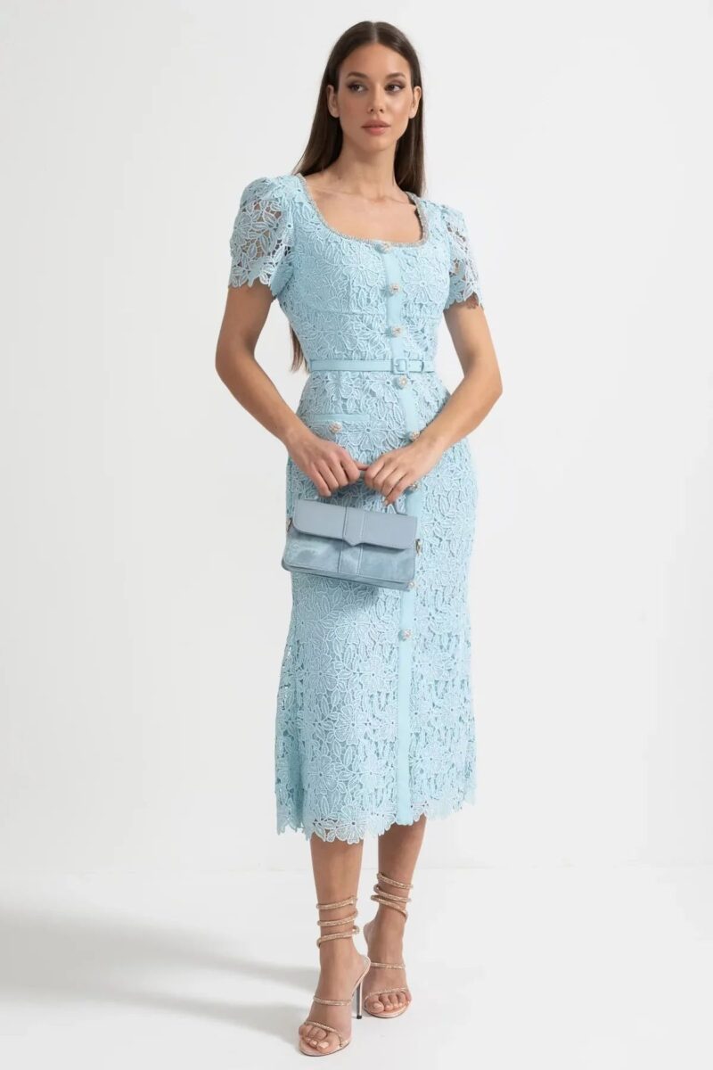 Această rochie midi emană un aer sofisticat și feminin, fiind piesa centrală perfectă pentru o garderobă de ocazie. Confecționată dintr-o dantelă guipure prețioasă, rochia se remarcă prin textura bogată și detaliile lucrate cu precizie.