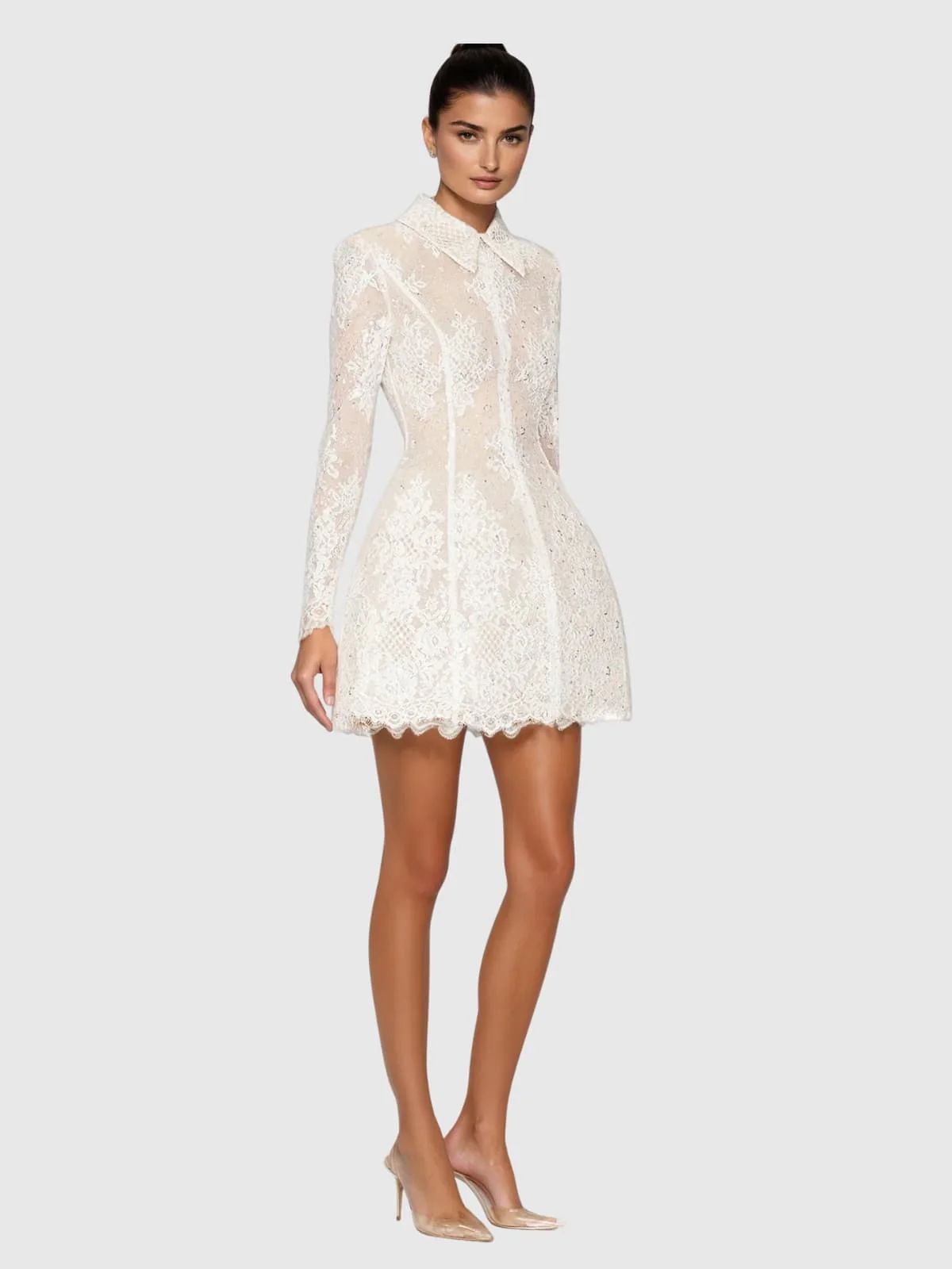Rochie mini albă din dantelă, realizată din material delicat, cu un design feminin și elegant. Croiala avantajează silueta, iar dantela fină adaugă un aer romantic și rafinat. Lungimea mini evidențiază picioarele, fiind ideală pentru ținute fresh și sofisticate. Căptușită pentru un plus de confort și opacitate. Perfectă pentru evenimente de zi, petreceri de vară, cununii civile sau apariții casual-elegante.