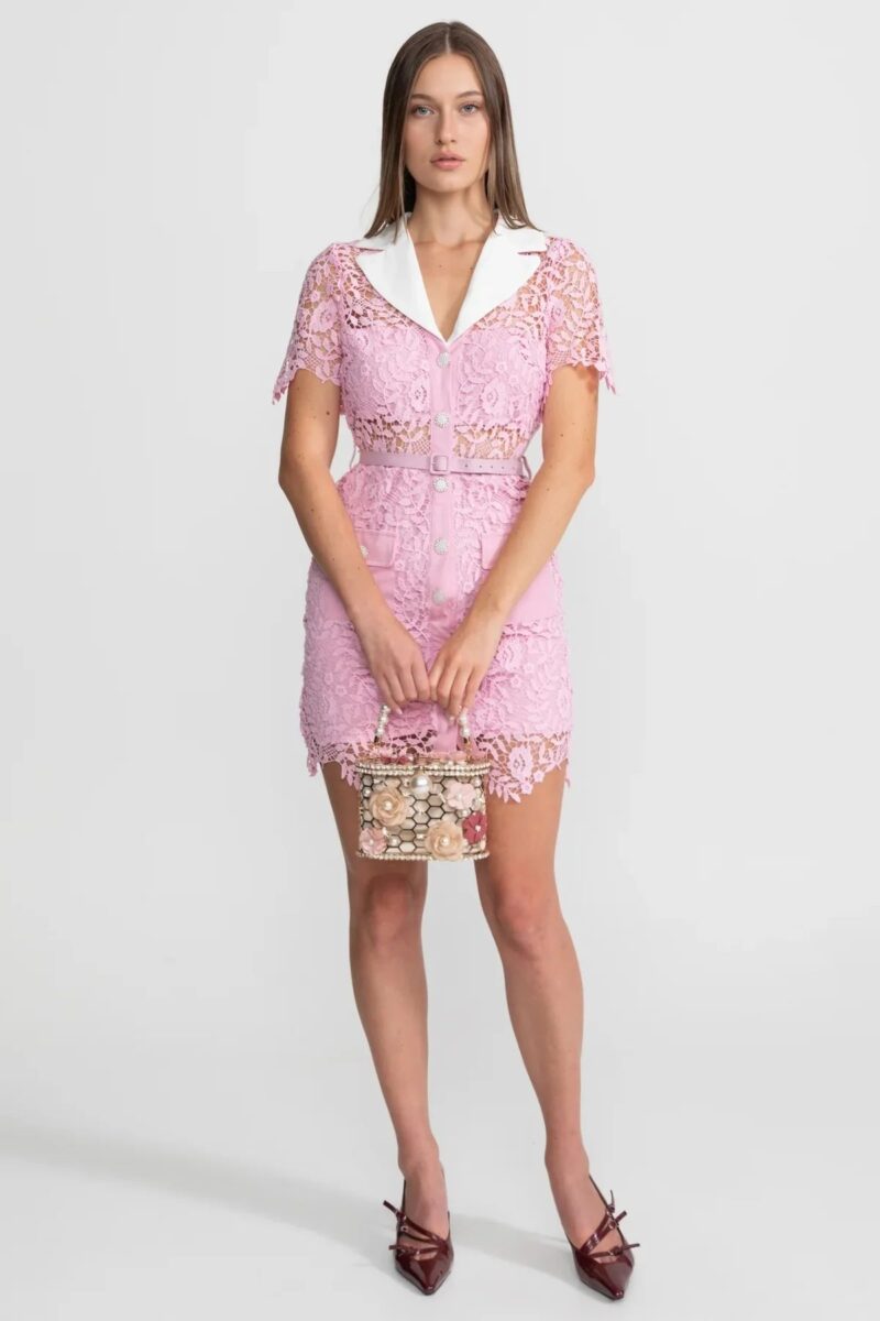 Această rochie mini redefinește eleganța clasică printr-o combinație texturată de dantelă și detalii moderne. Croiala cambrată este evidențiată de o curea subțire în talie, realizată din piele ecologică mată, care armonizează silueta.