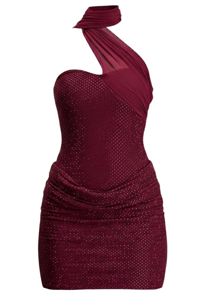 Atrage toate privirile cu această rochie mini sofisticată, realizată într-o nuanță intensă de burgundy. Designul asimetric, cu detaliu tip eșarfă delicată în jurul gâtului, adaugă un aer rafinat și modern. Partea superioară este decorată cu aplicații fine strălucitoare, care captează lumina și oferă un efect glam subtil.