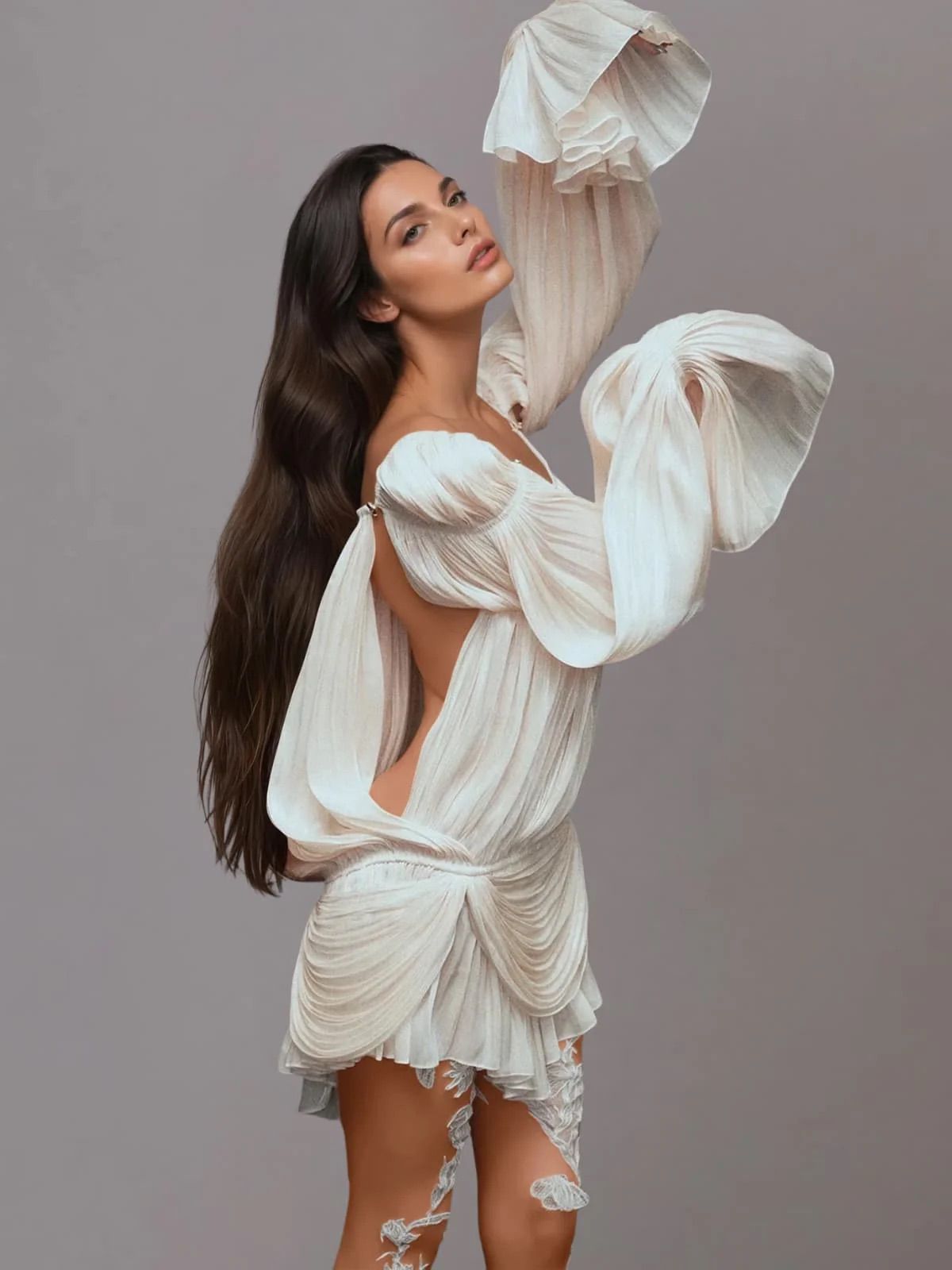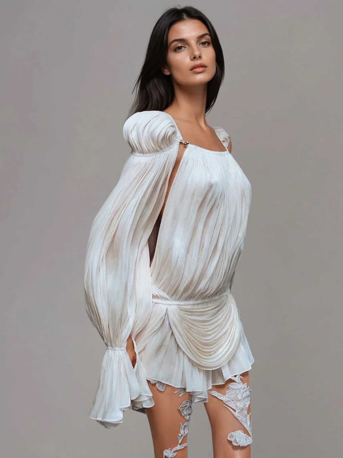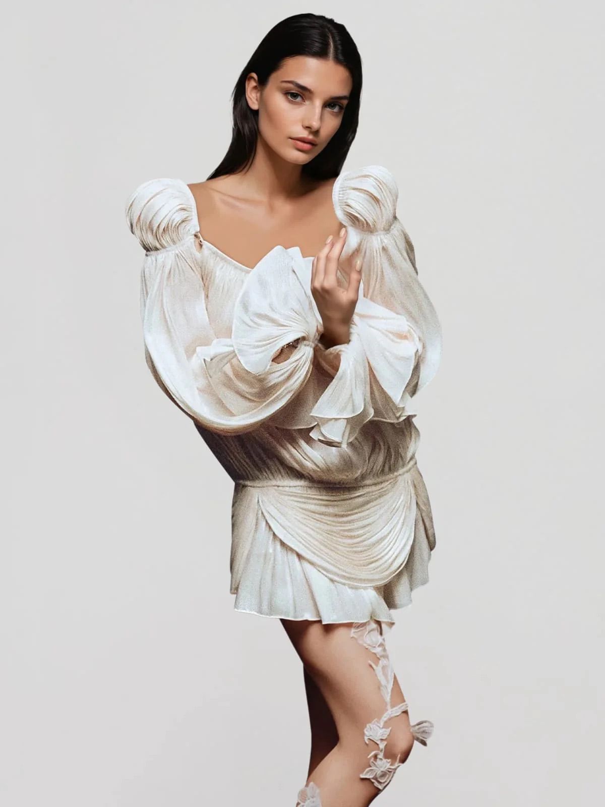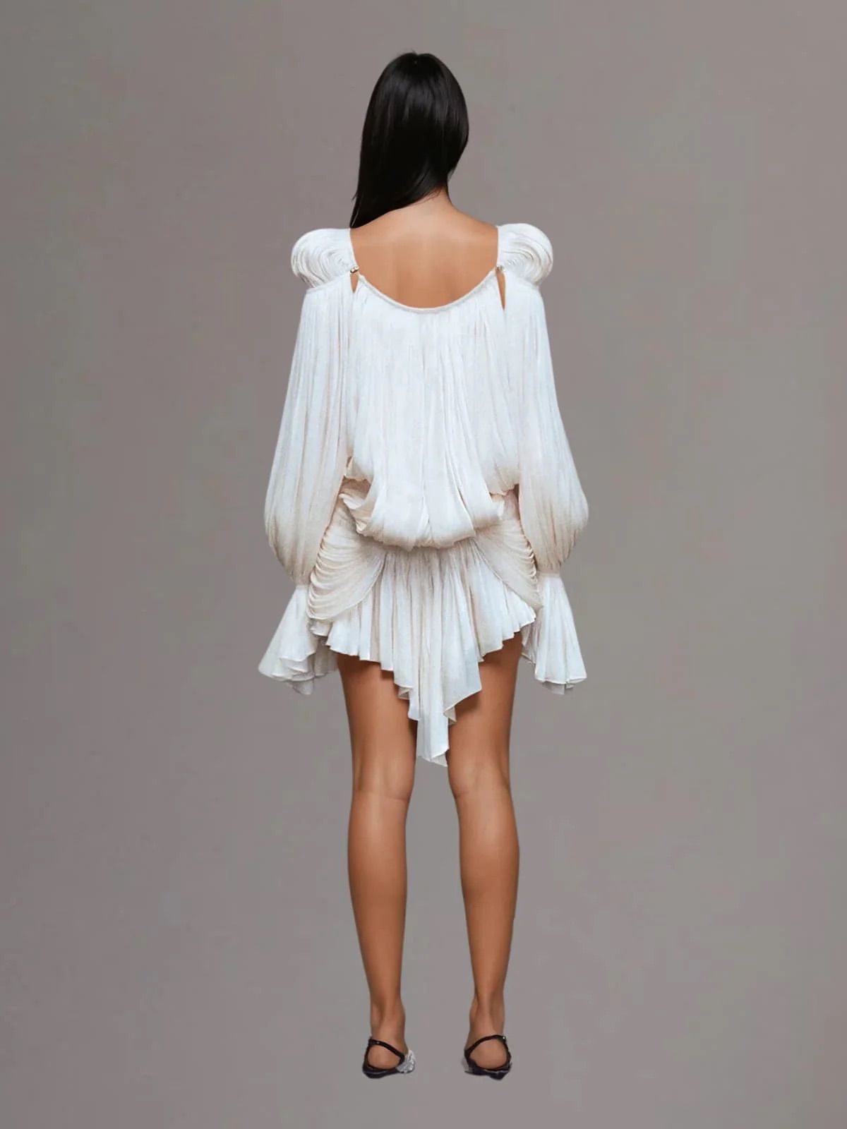 Este o rochie mini, evazată, de culoare neutră (bej deschis sau fildeș), confecționată dintr-un material ușor, plisat. Are un design cu umerii goi , mâneci lungi cu manșete evazate și detalii drapate. Tivul este finisat cu volane suprapuse.