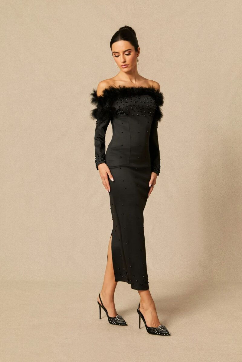 Această rochie de un negru intens este definiția glamourului și senzualității, fiind alegerea ideală pentru evenimente speciale sau petreceri unde vrei să fii în centrul atenției.