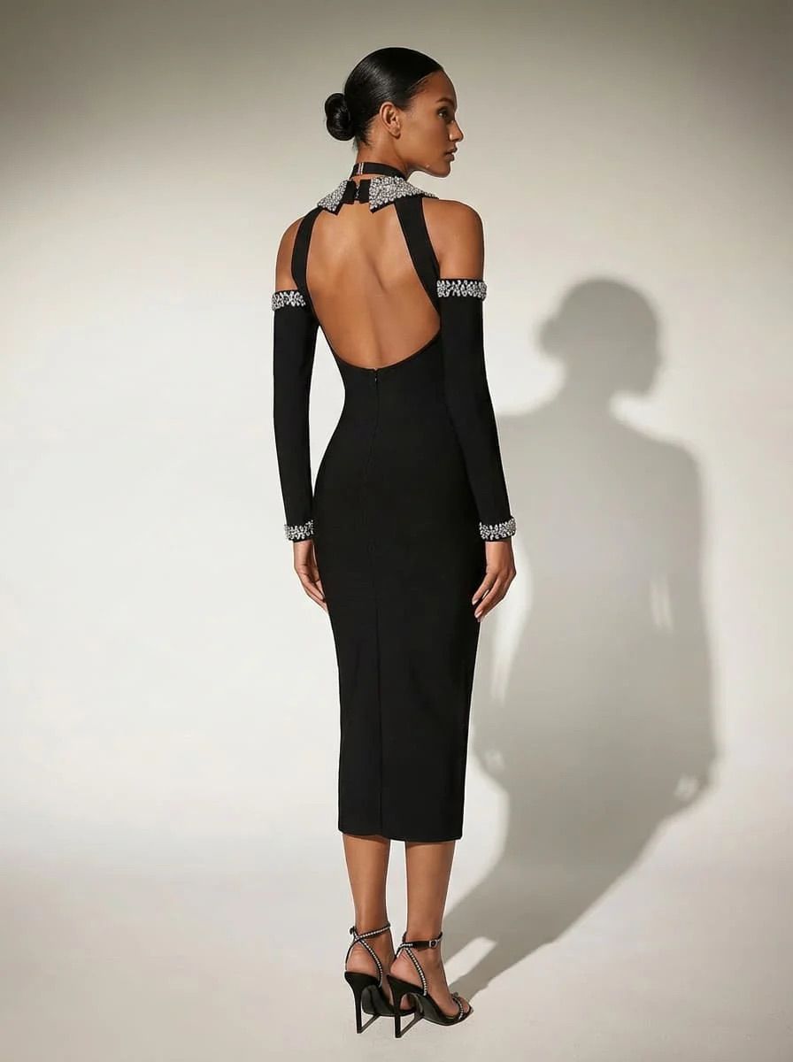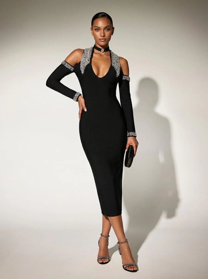 Mânecile sunt lungi, dar rochia este decupată la nivelul umerilor, lăsându-i la vedere. Pe umeri și la manșete sunt aplicate detalii decorative strălucitoare, cu aspect de pietre sau cristale, care adaugă un plus de rafinament și lux. Materialul este neted și elastic, ceea ce contribuie la aspectul sofisticat și bine structurat.