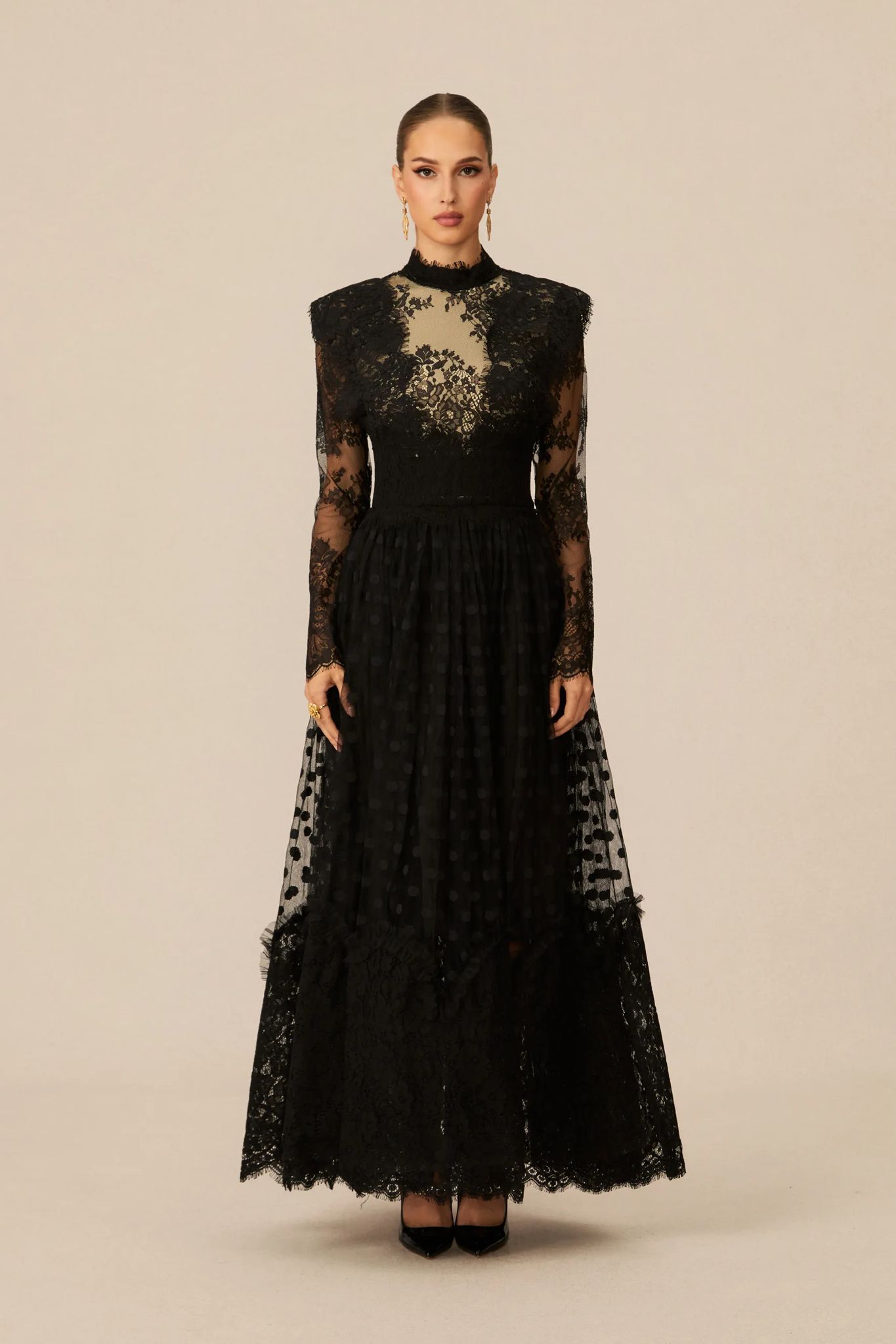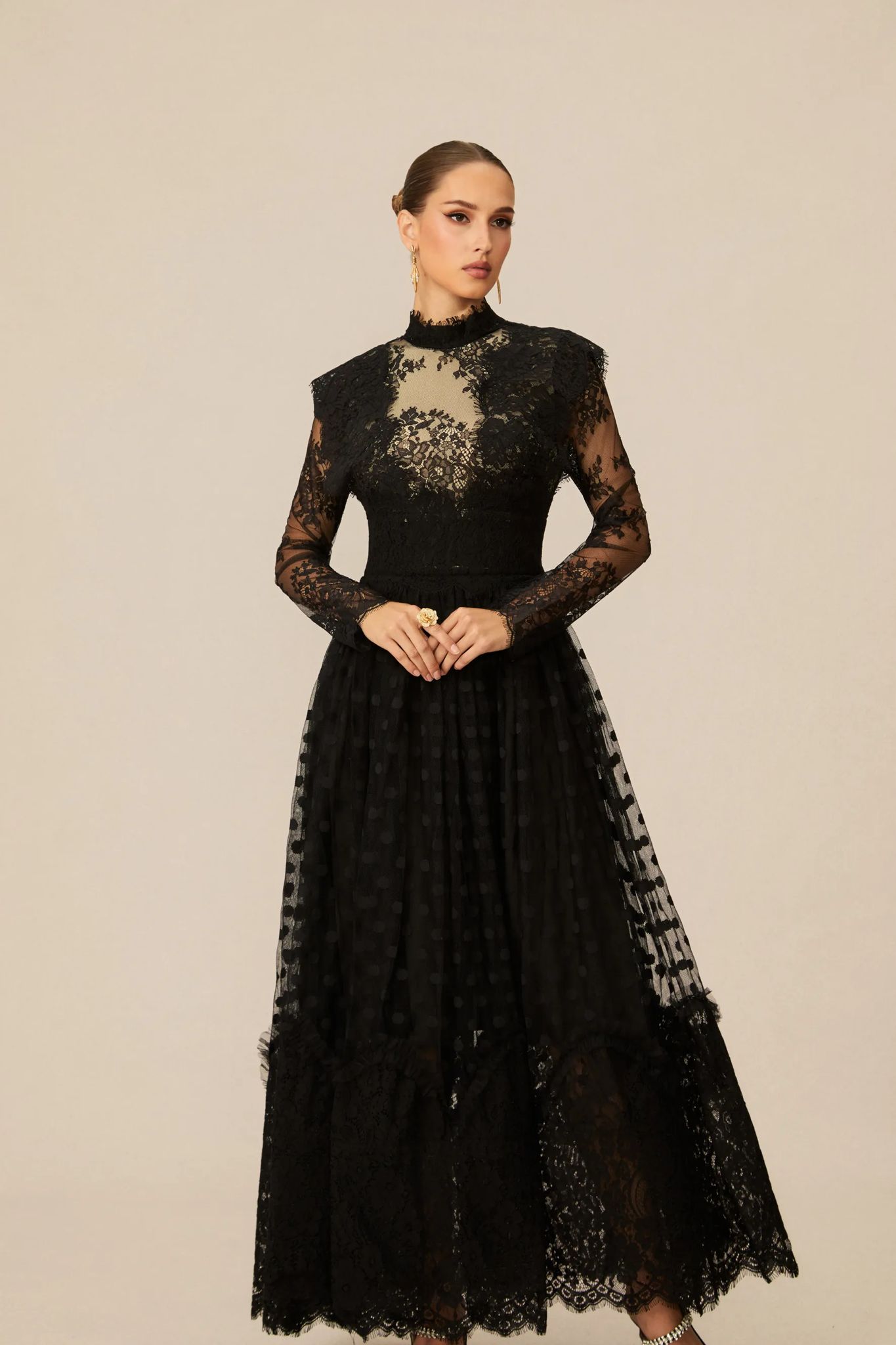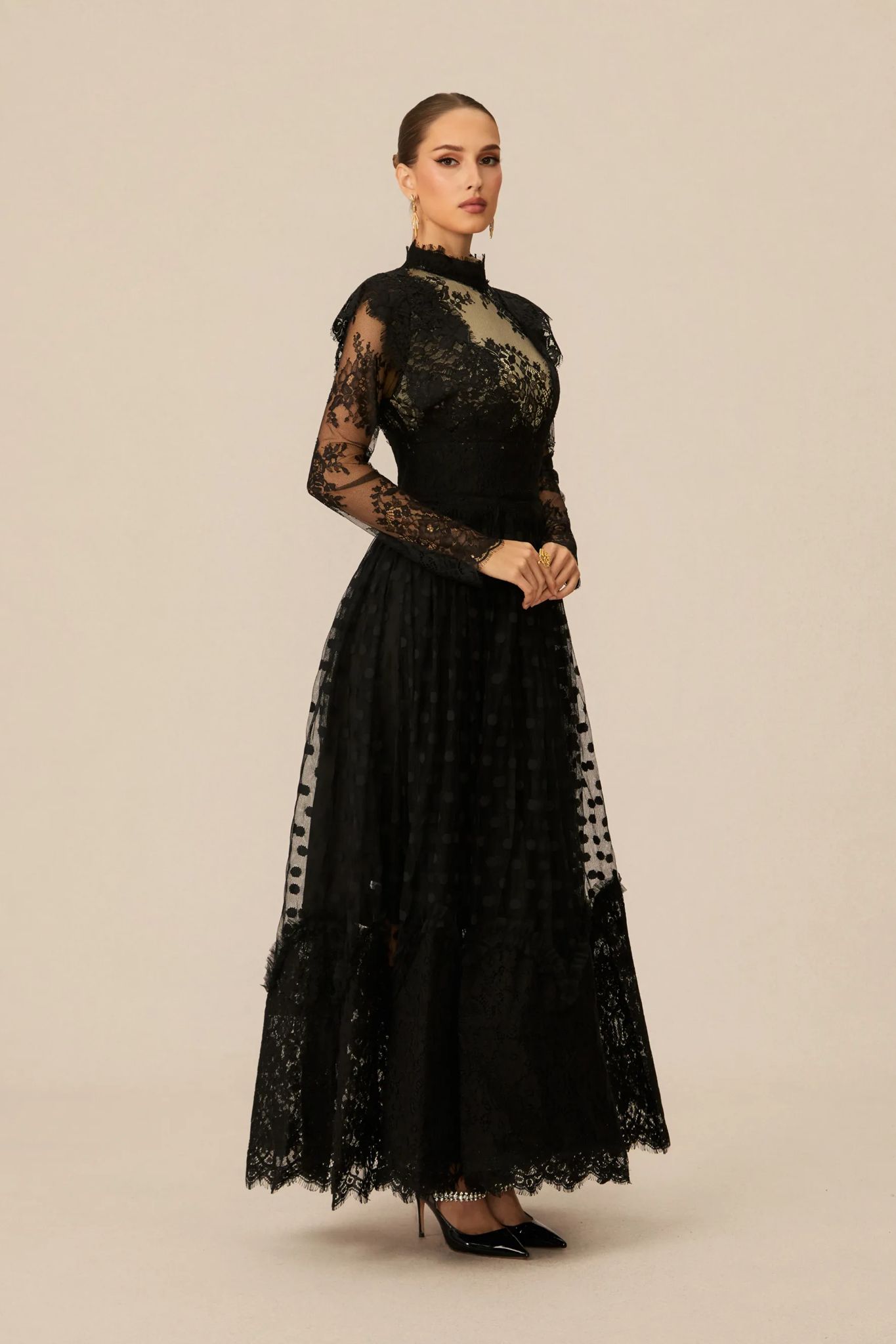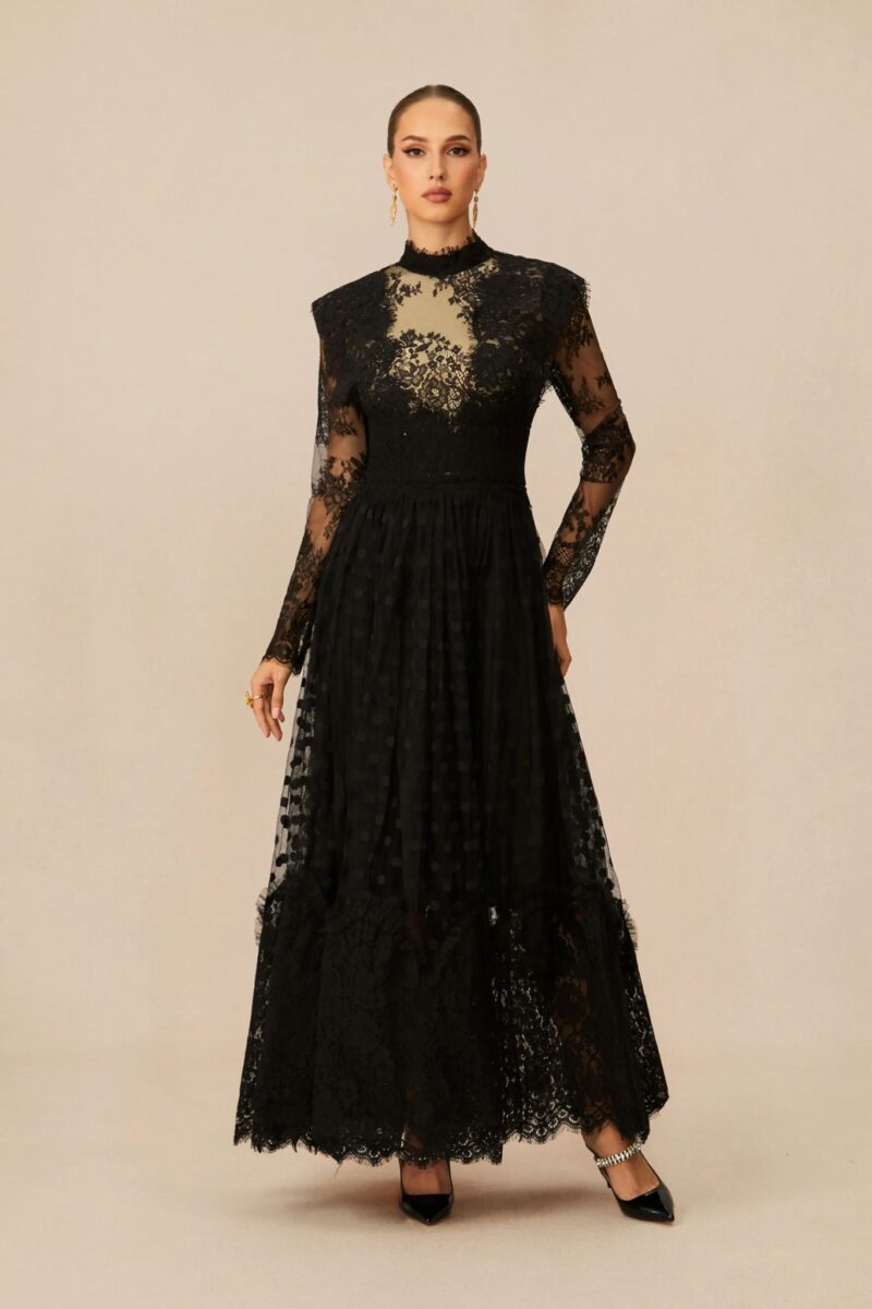 Rochia lungă din dantelă de culoare neagră, este o piesă de o eleganță aparte, ce emană rafinament și senzualitate în orice context special.