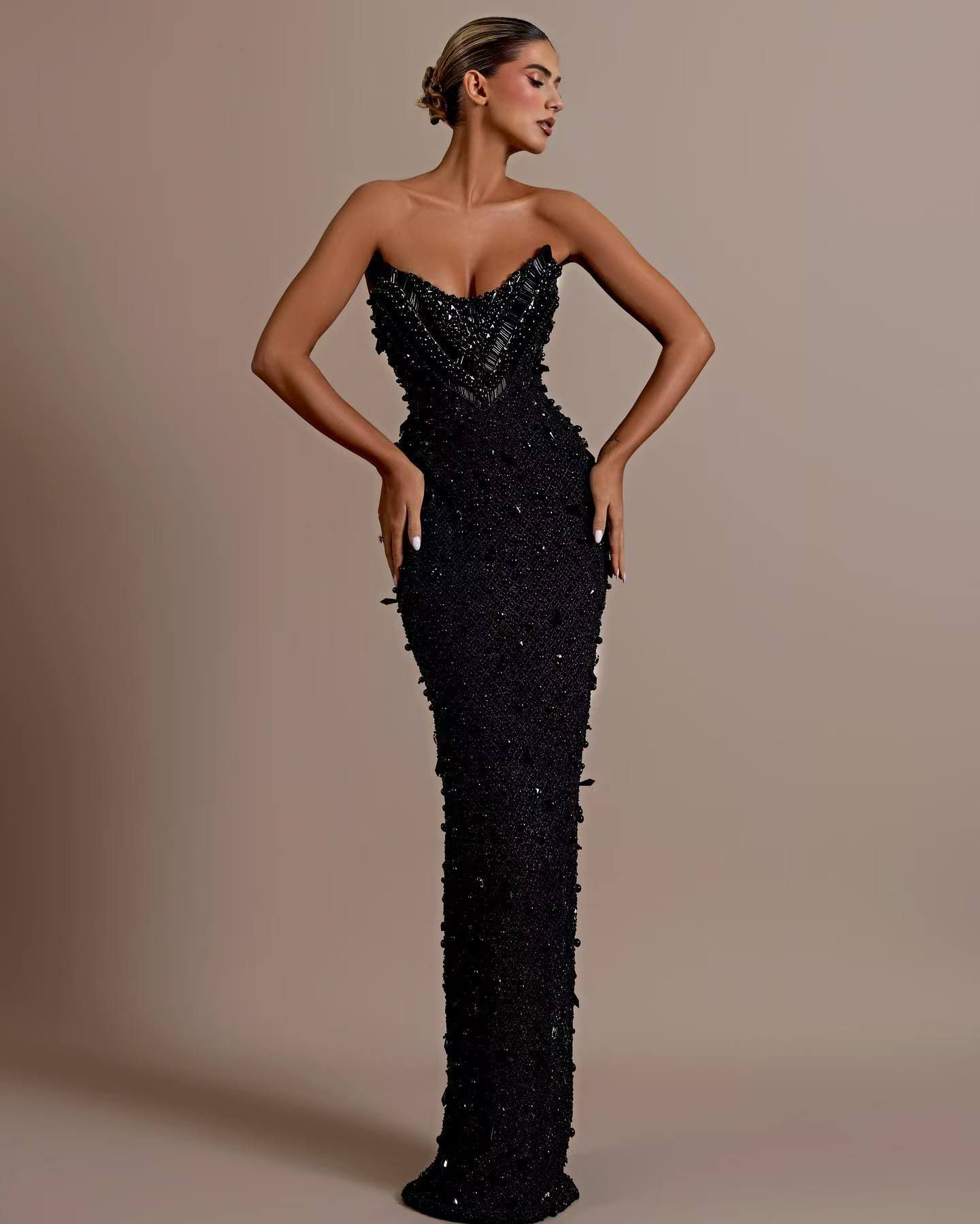 Această rochie neagră, concepută pentru evenimente speciale, este o alegere îndrăzneață și ultra-feminină, potrivită pentru femeile care vor să își exprime eleganța într-un mod captivant. Rochia este mulată pe corp, accentuează silueta și scoate în evidență formele naturale într-un mod rafinat, dar senzual.