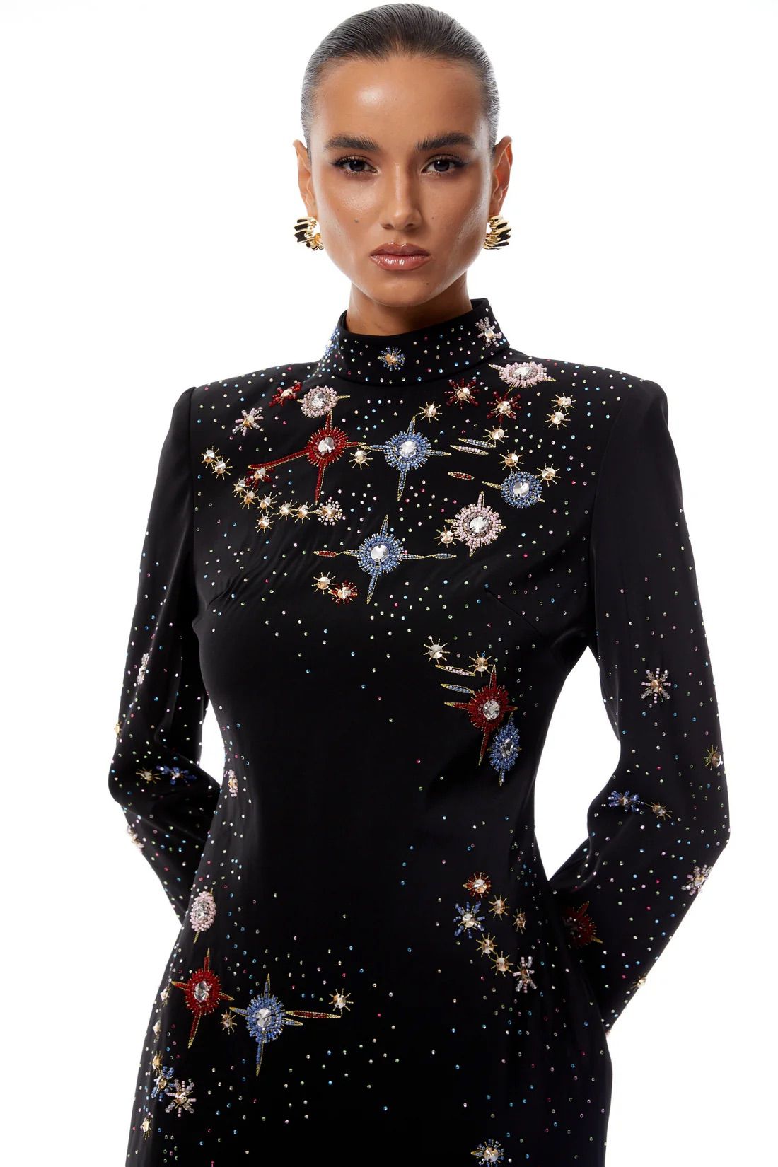 Rochia mini Nebula Noir îmbină misterul cosmic cu eleganța modernă. Cu un gât înalt ce alungește silueta și mâneci lungi ce adaugă rafinament, piesa este decorată cu un imprimeu cosmic fascinant, inspirat de stele, nebuloase și galaxii îndepărtate. Materialul elastic urmărește delicat formele corpului, oferind confort și un aer seducător. Ideală pentru apariții îndrăznețe, petreceri nocturne sau momente în care vrei să strălucești ca un univers propriu.