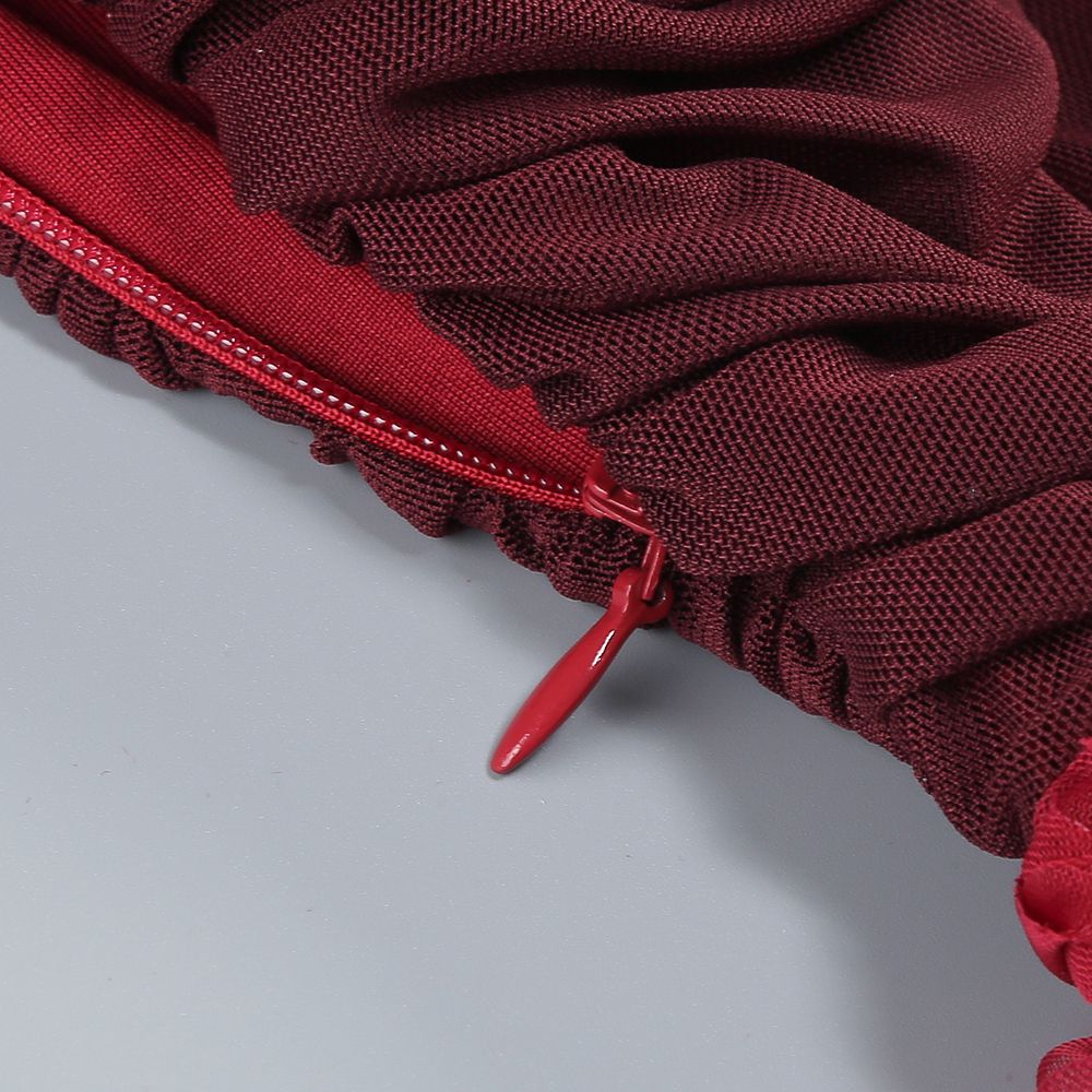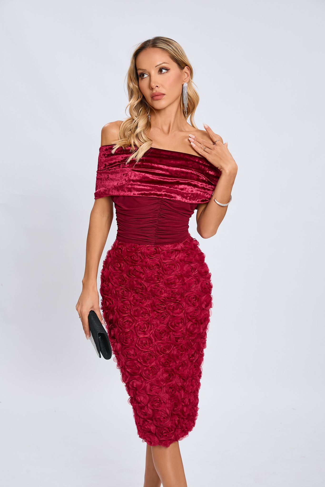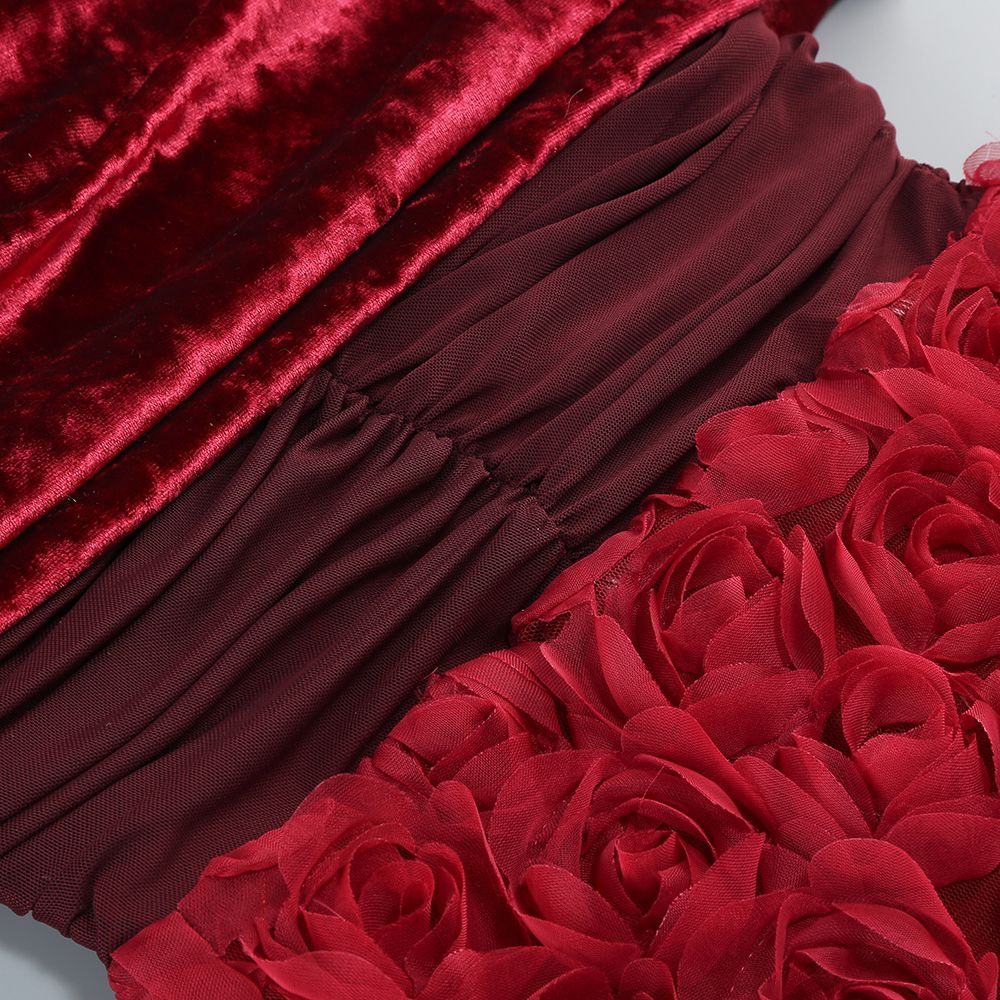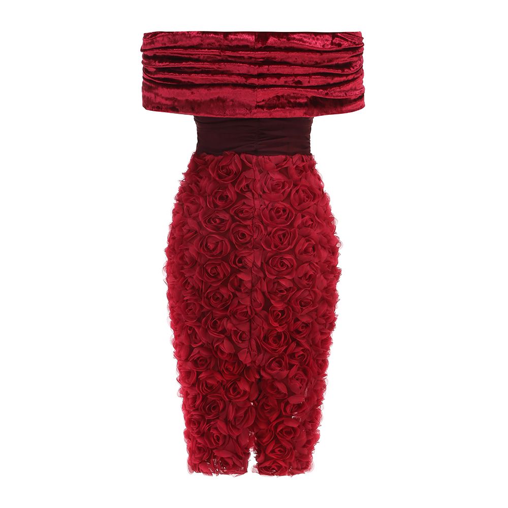 Această rochie sofisticată, într-o nuanță profundă de roșu burgund, este o alegere elegantă și rafinată pentru evenimente speciale. Partea superioară este realizată din catifea fină, cu un design drapat ce creează un efect de textură bogată, accentuând delicat linia umerilor și oferind un aer de feminitate senzuală. Decolteul tip bardot, lăsat pe umeri, adaugă un plus de romantism și eleganță clasică.