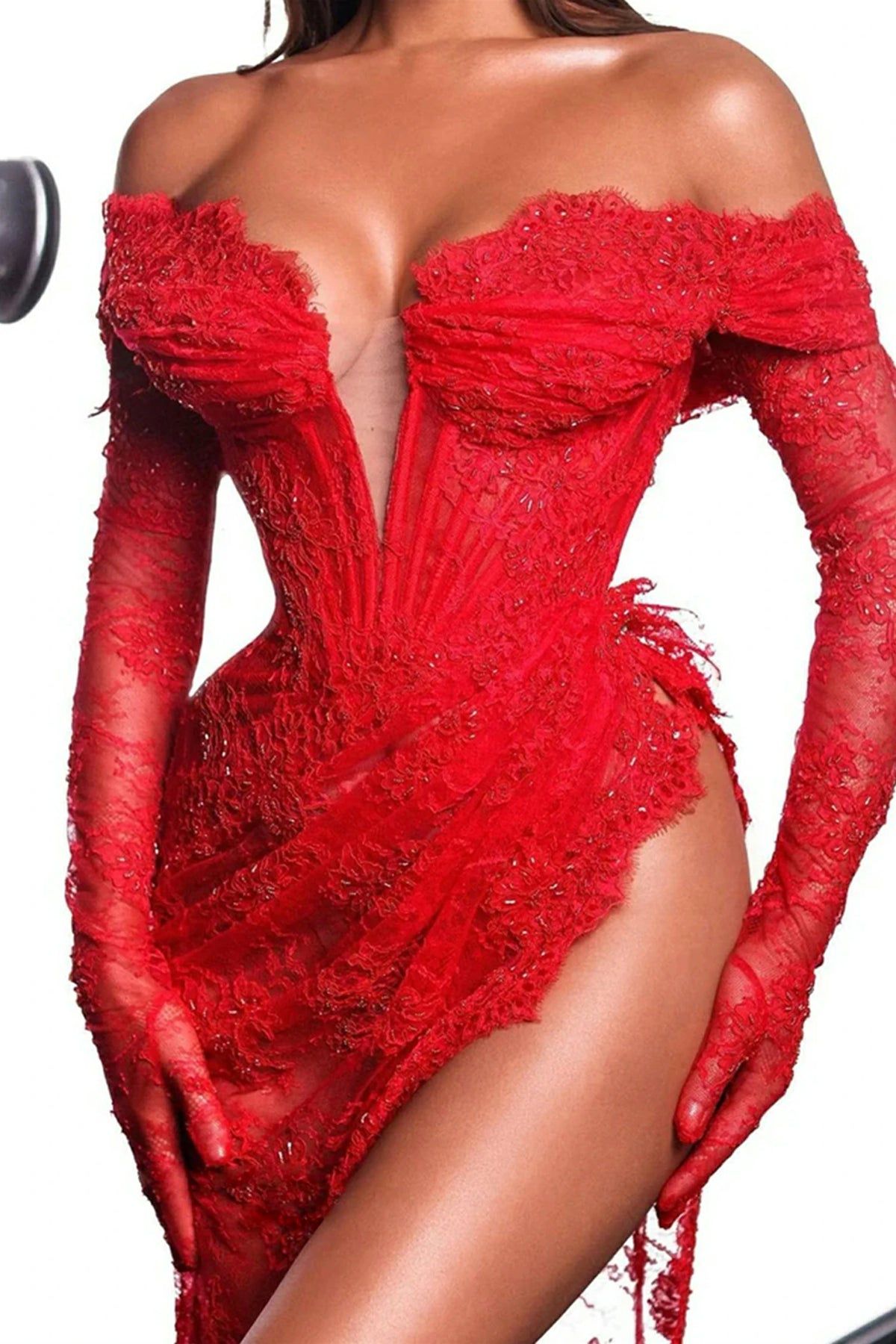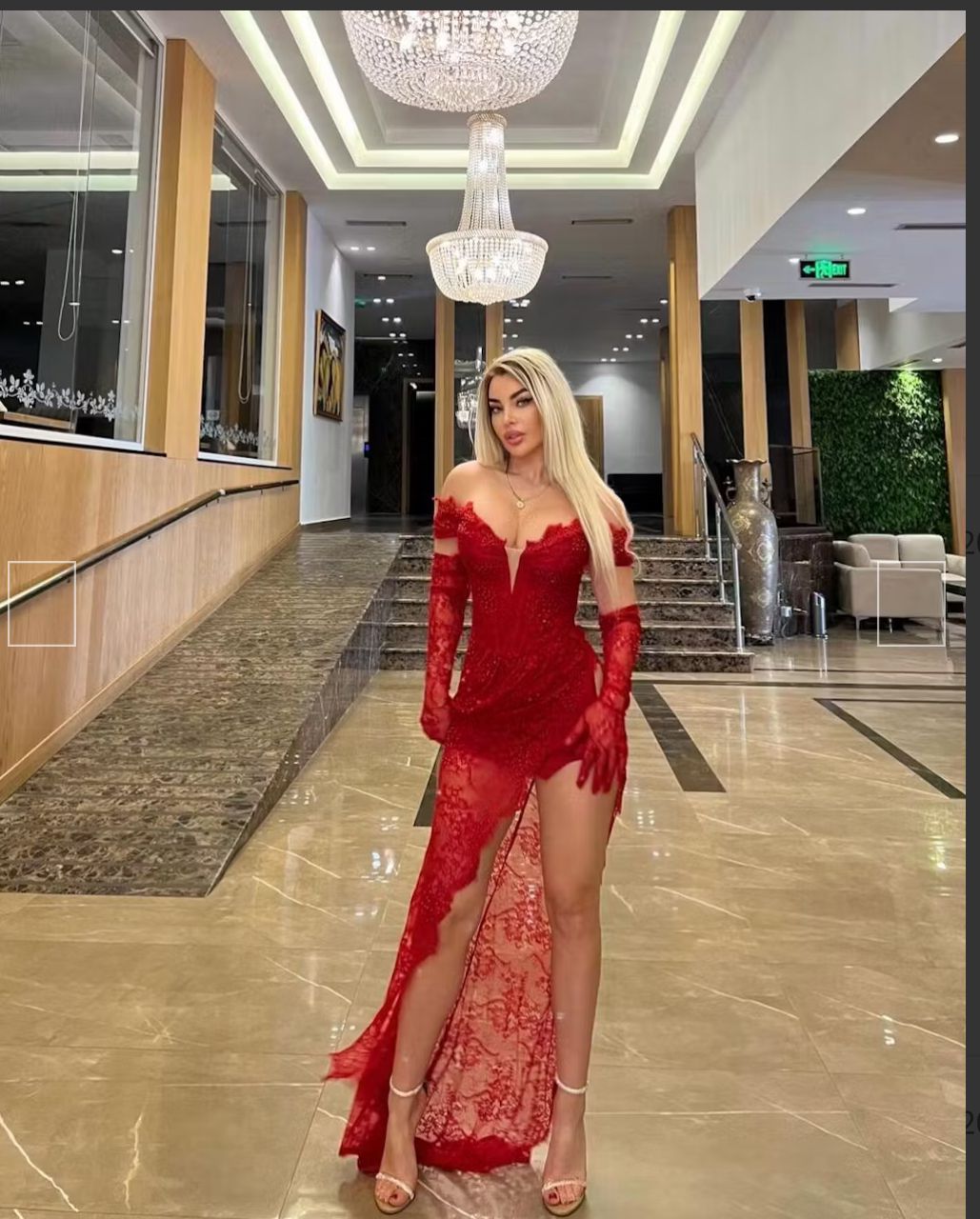 Această rochie roșie din dantelă este concepută special pentru femeile care adoră să impresioneze. Croiala spectaculoasă cu umeri căzuți, decupaje laterale provocatoare și slit foarte înalt subliniază elegant silueta și creează o apariție de neuitat. Textura fină a dantelei, combinată cu trena lungă, adaugă dramatism și rafinament, transformând rochia într-o adevărată piesă statement.