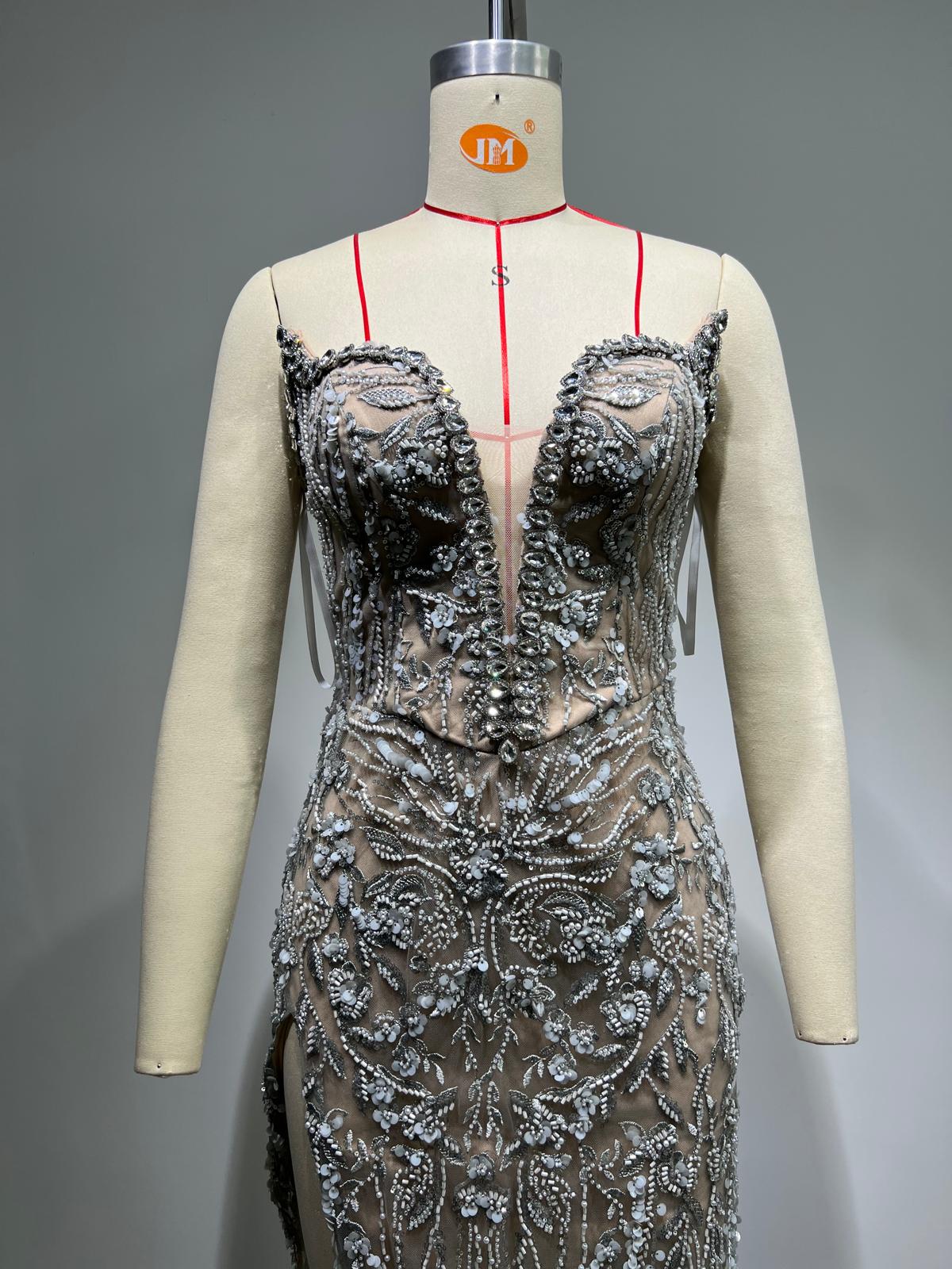 O rochie aurie impresionantă, concepută pentru a atrage toate privirile, emană rafinament și opulență. Fabricată dintr-un material argintiu strălucitor, care reflectă lumina pentru un efect spectaculos, această piesă de excepție se remarcă printr-o fantă laterală amplă, ce adaugă un strop de îndrăzneală și senzualitate.