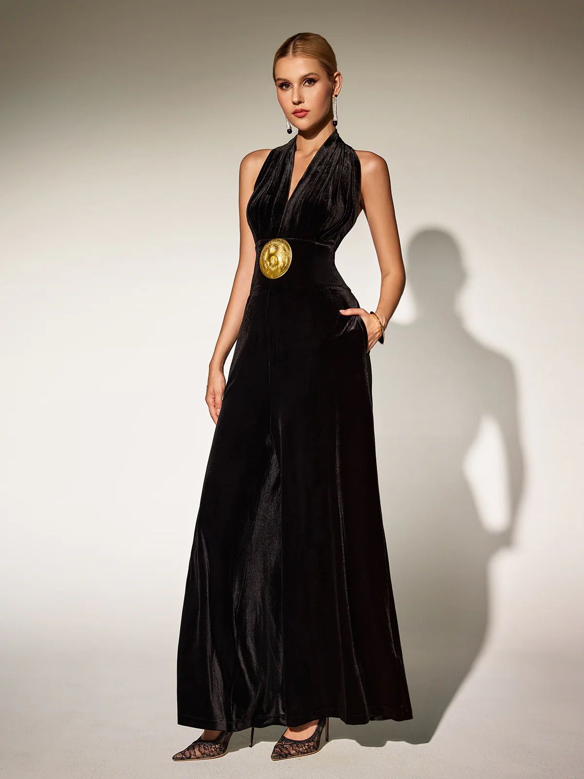 Salopetă elegantă neagră din catifea, cu croială evazată (wide-leg) și un decolteu halter adânc în V.
