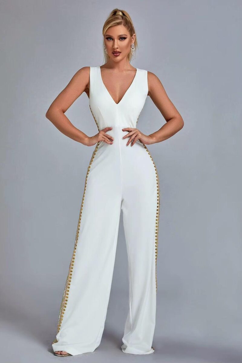 Salopeta este accesorizată în talie cu o centură lată, aurie, care are o cataramă circulară decorativă, de asemenea aurie, posibil cu un logo sau un model în relief. Modelul poartă cercei lungi, subțiri și o brățară, ambele de culoare aurie, pentru a completa aspectul sofisticat.